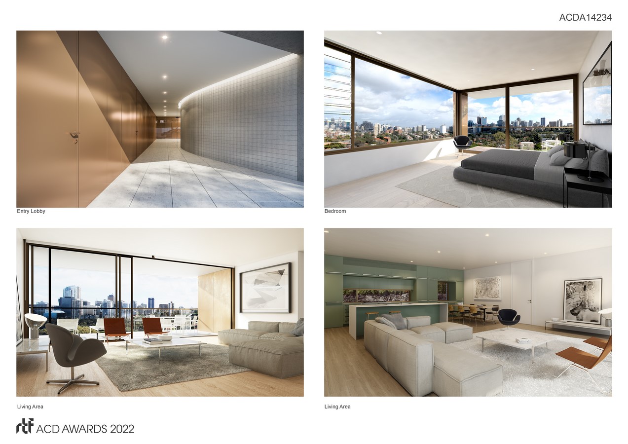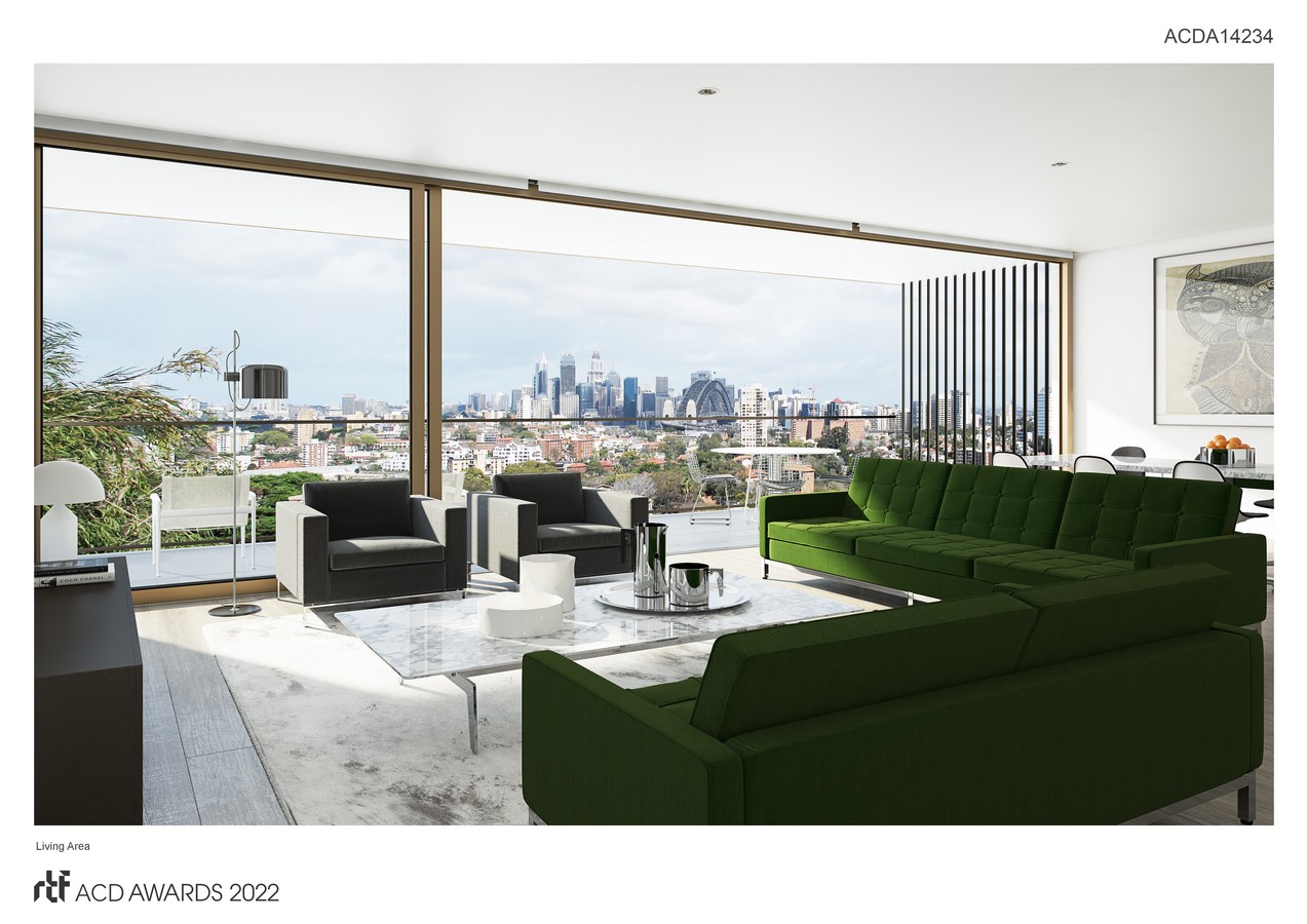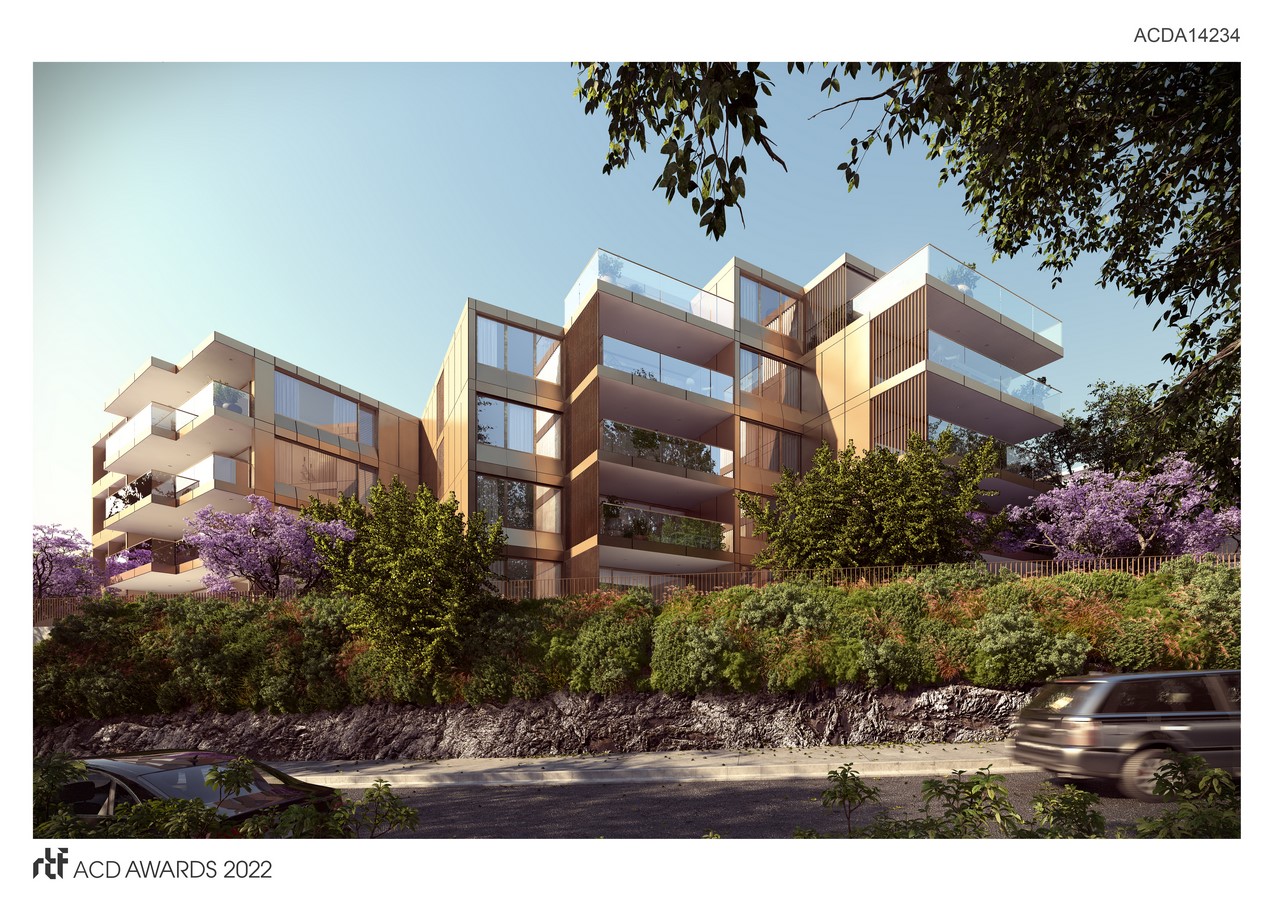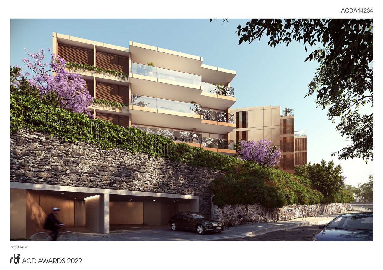 Two irregular shaped, steeply sloping sites have been amalgamated for this 13 unit residential development, however the local Council were insistent that there must be two separate buildings on the site to reflect the original development patterns in the area. The southern building has five levels, containing nine three bedroom units, with iconic views of the Sydney Harbour Bridge and CBD, while the northern building has four levels, containing four three bedroom units, with westerly views over North Sydney.