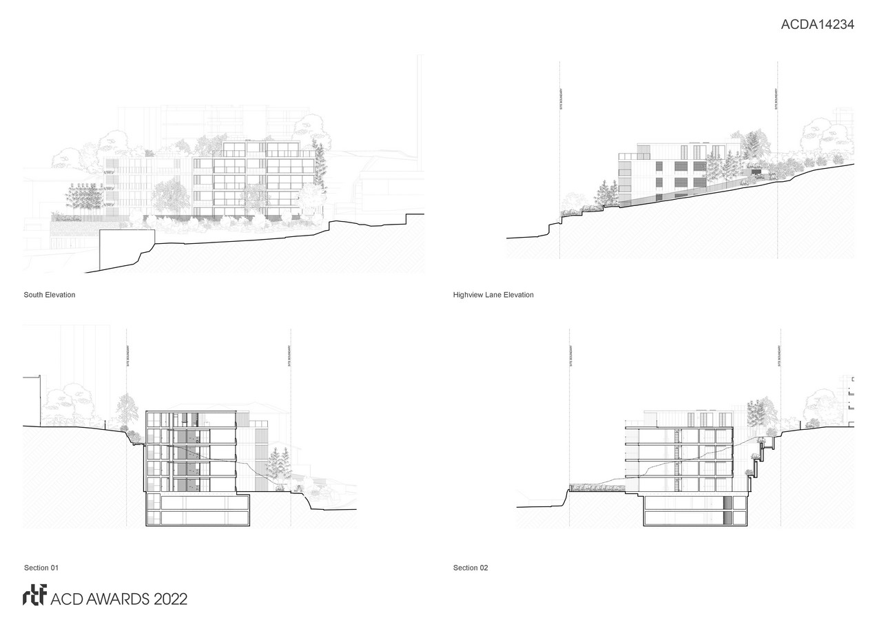 The building form is staggered in plan to break down the apparent scale and maximise views from all units. The site is excavated to form a level platform above the basement parking, with a three level sandstone rock face to the eastern boundary, shielding the building from neighbours on the uphill slope, while maintaining their views over the site. Interstitial spaces between buildings form landscaped courtyards for the lower level units, while landscaping to the eastern, uphill, boundary contains a secondary entry from the side laneway.