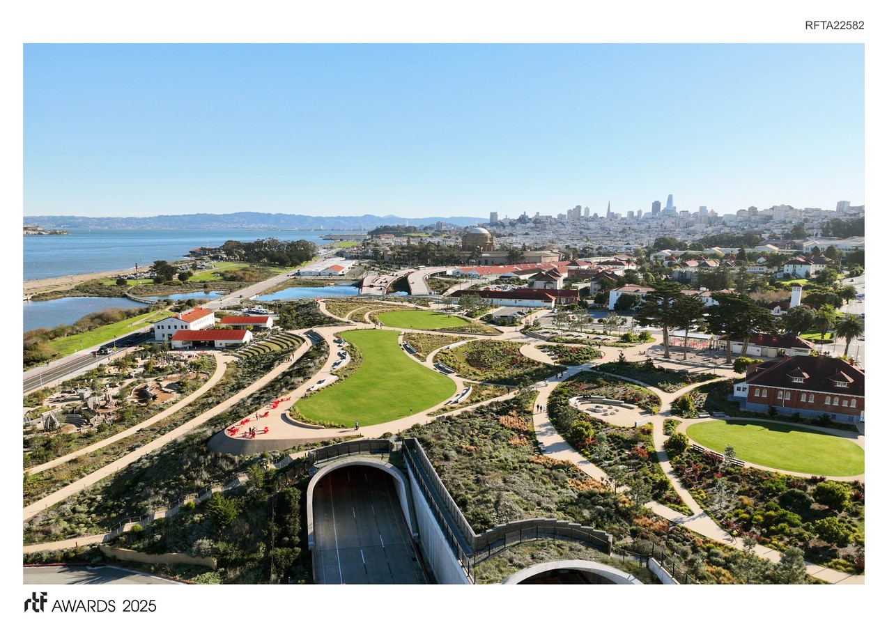 Bridging over 7 lanes of the newly tunneled Presidio Parkway, Presidio Tunnel Tops is a 14-acre national park that reconnects San Francisco with the Bay.