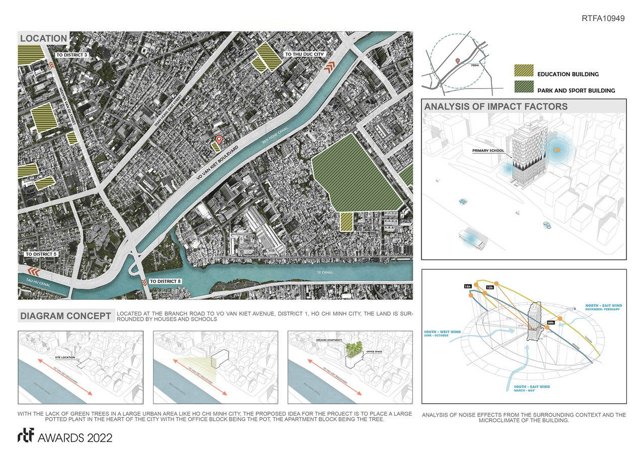 The investor’s request to build a different identity but still show the rationality from function to form has led to the idea of ”big potted plants in the heart of the city”, office blocks are pots, apartment blocks. is tree. The contrast in the design lines of the base block and the upper part makes the work even more outstanding.