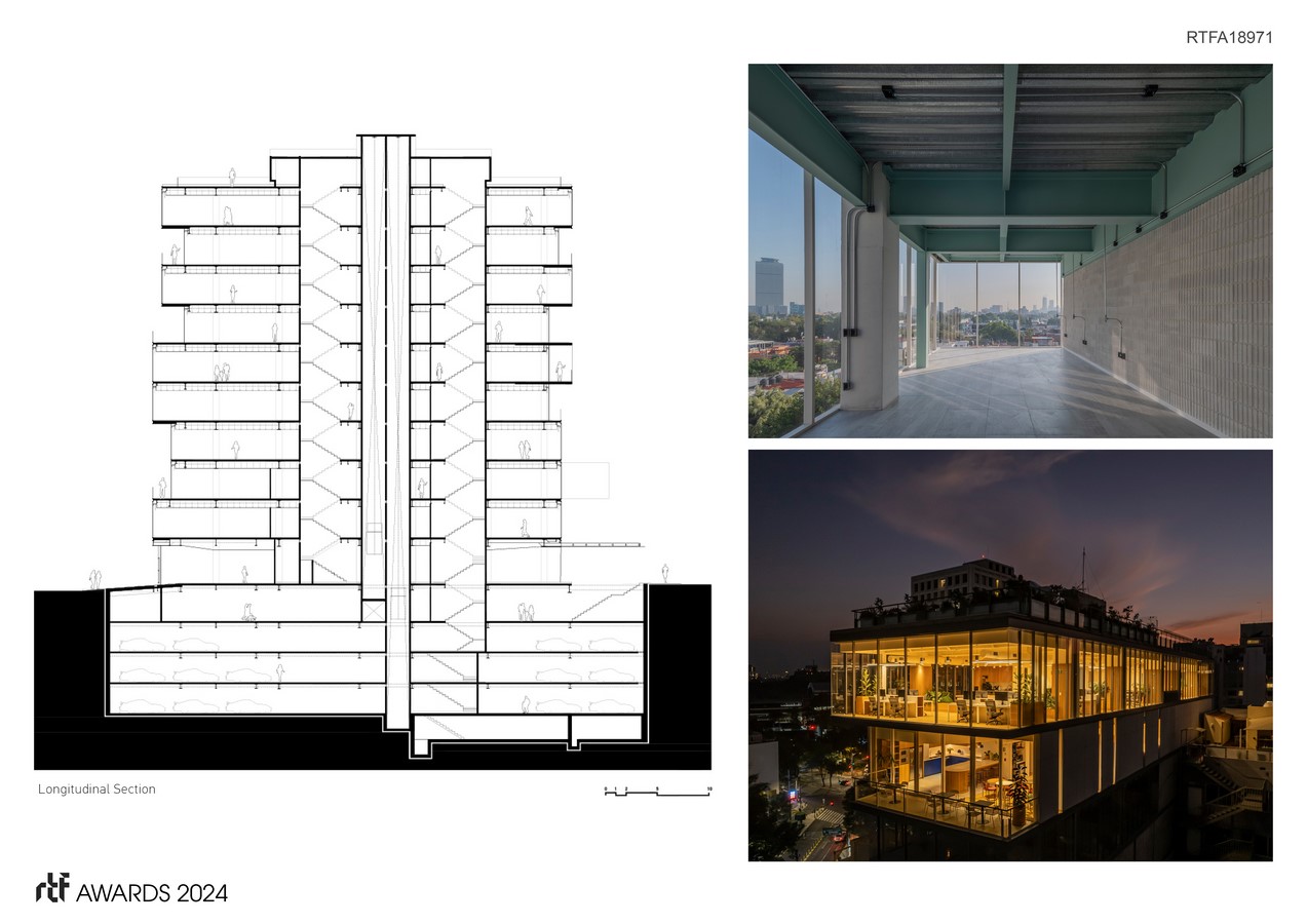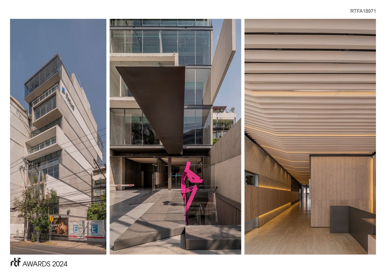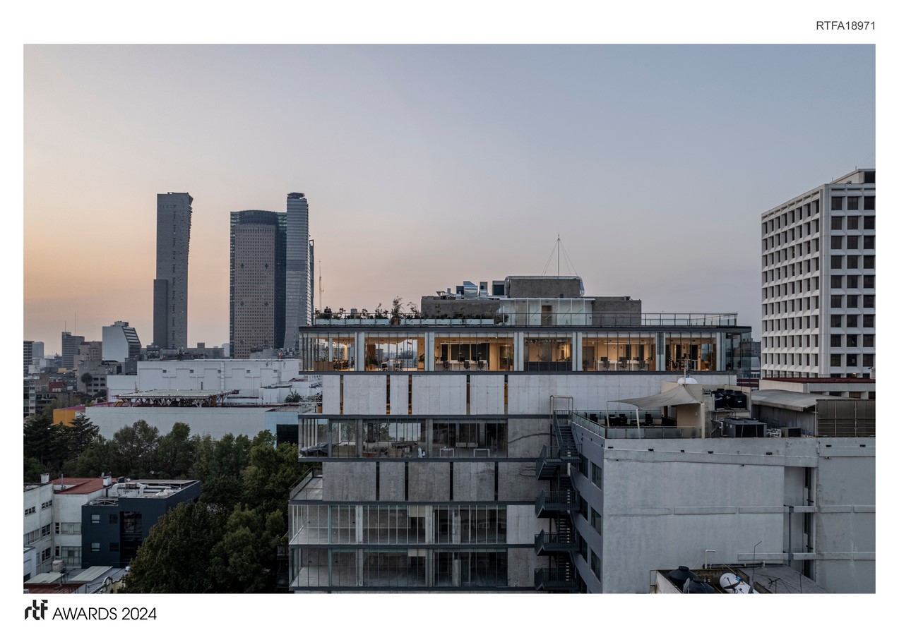 A building as slender as QO is not common in the urban layout of Mexico and it was not easy to comply with its codes and regulations. Solving its circulations, accesses and flows was truly a challenge. Nonetheless, seen from above, the building reveals an interesting integration with the roofs, stairs and near façades. It becomes part and adds to Mexico City’s diverse urban ambience.