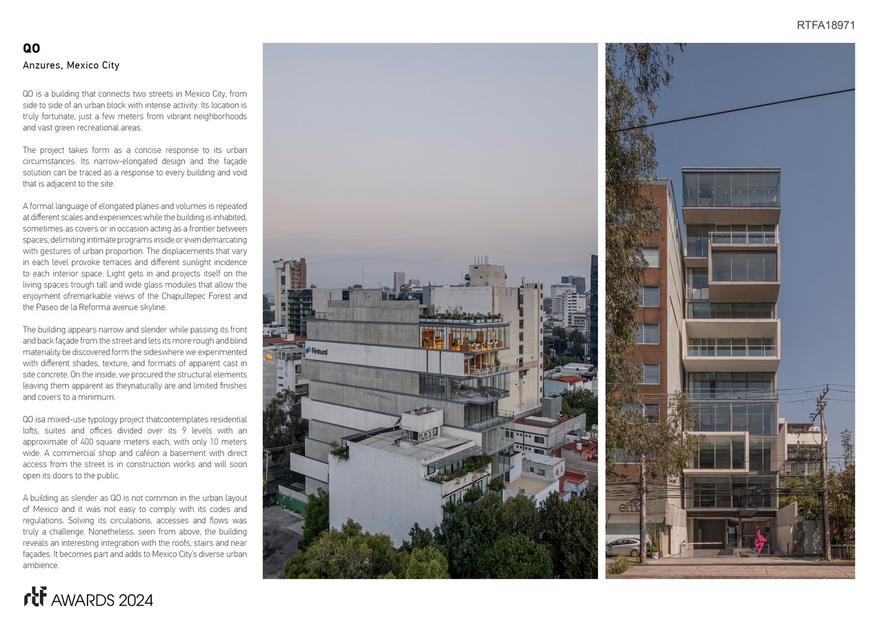 QO is a building that connects two streets in Mexico City, from side to side of an urban block with intense activity. Its location is truly fortunate, just a few meters from vibrant neighborhoods and vast green recreational areas.