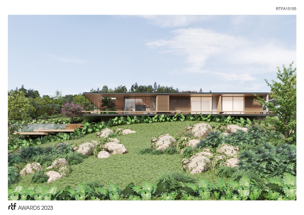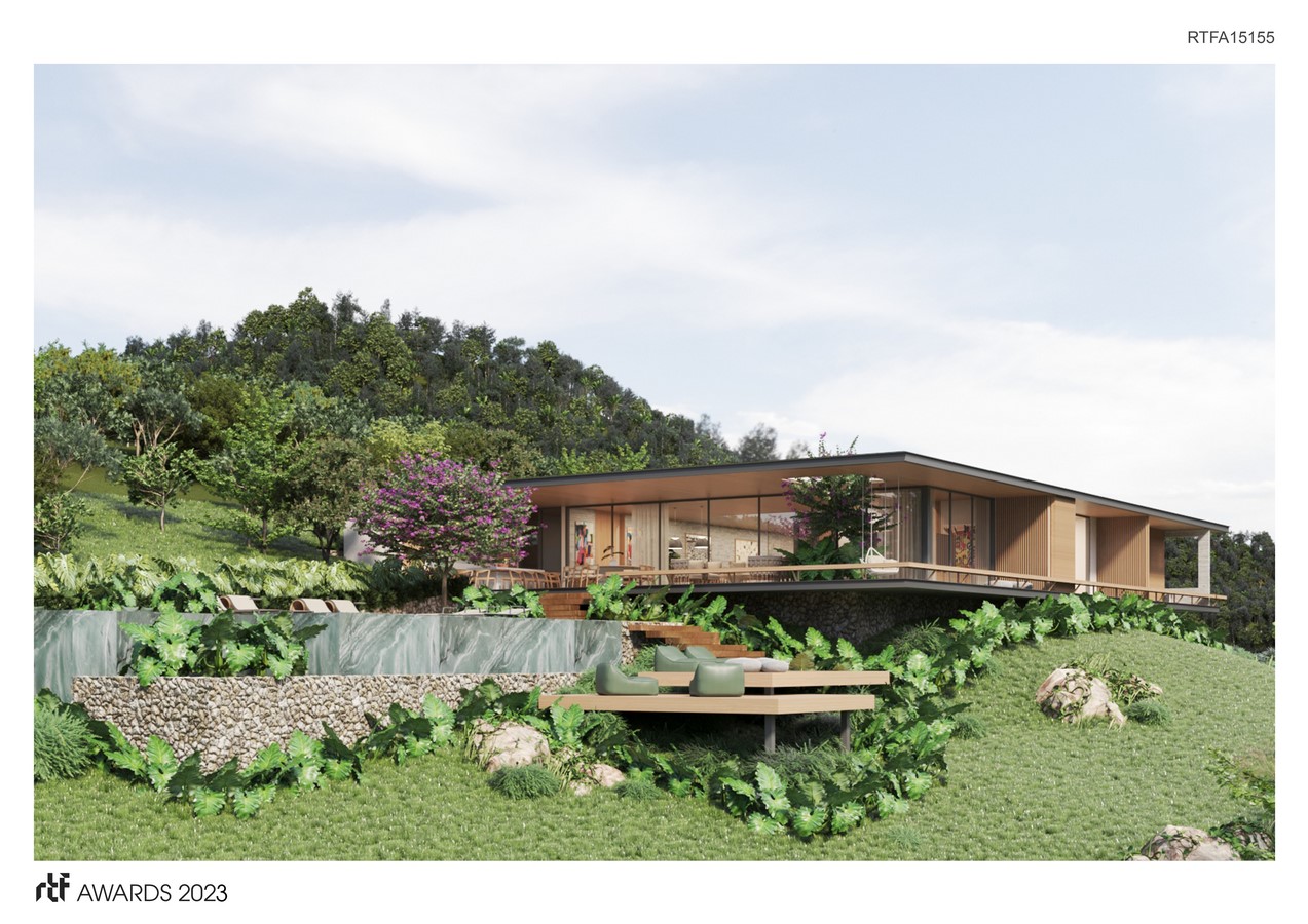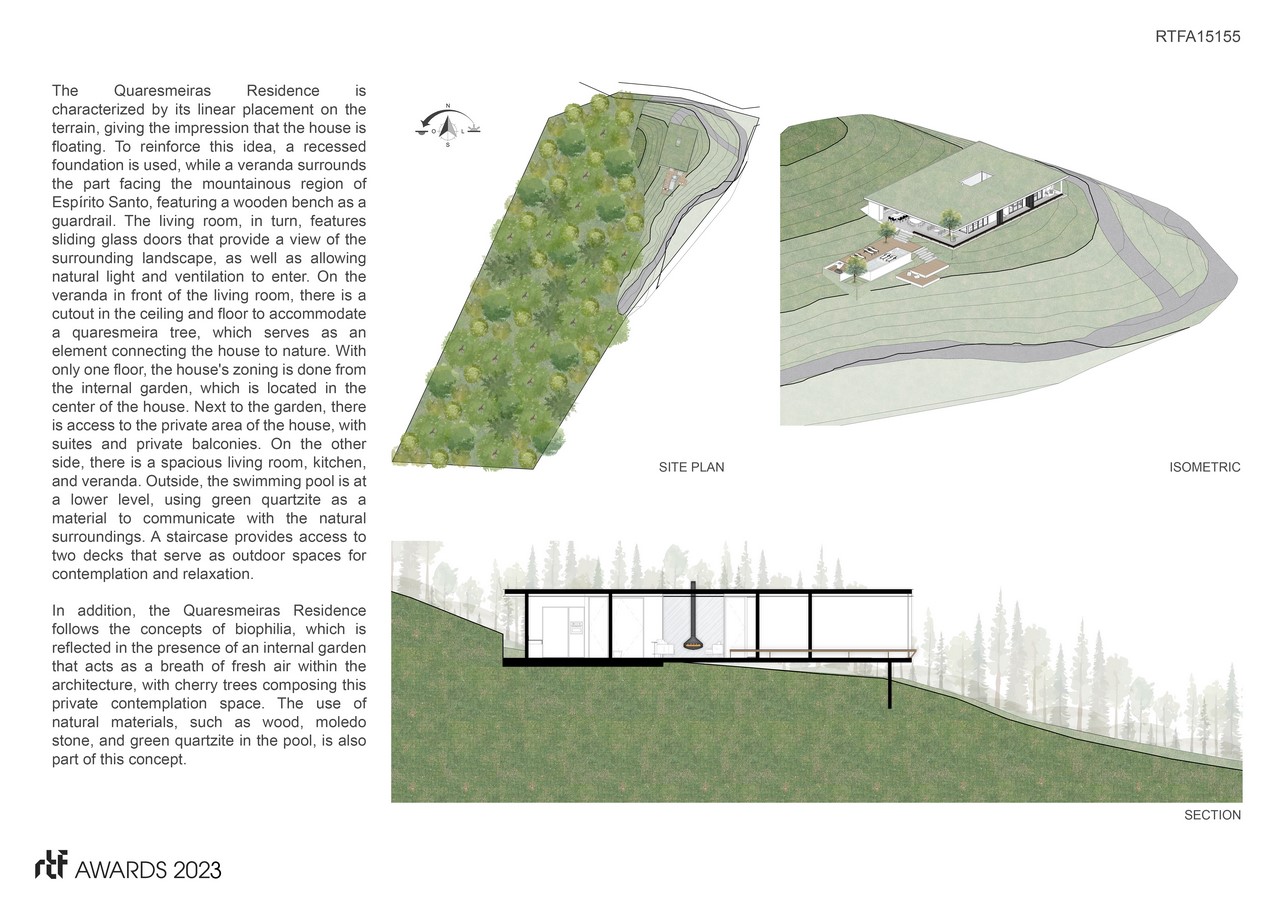 The Quaresmeiras Residence is characterized by its linear placement on the terrain, giving the impression that the house is floating. To reinforce this idea, a recessed foundation is used, while a veranda surrounds the part facing the mountainous region of Espírito Santo, featuring a wooden bench as a guardrail.
