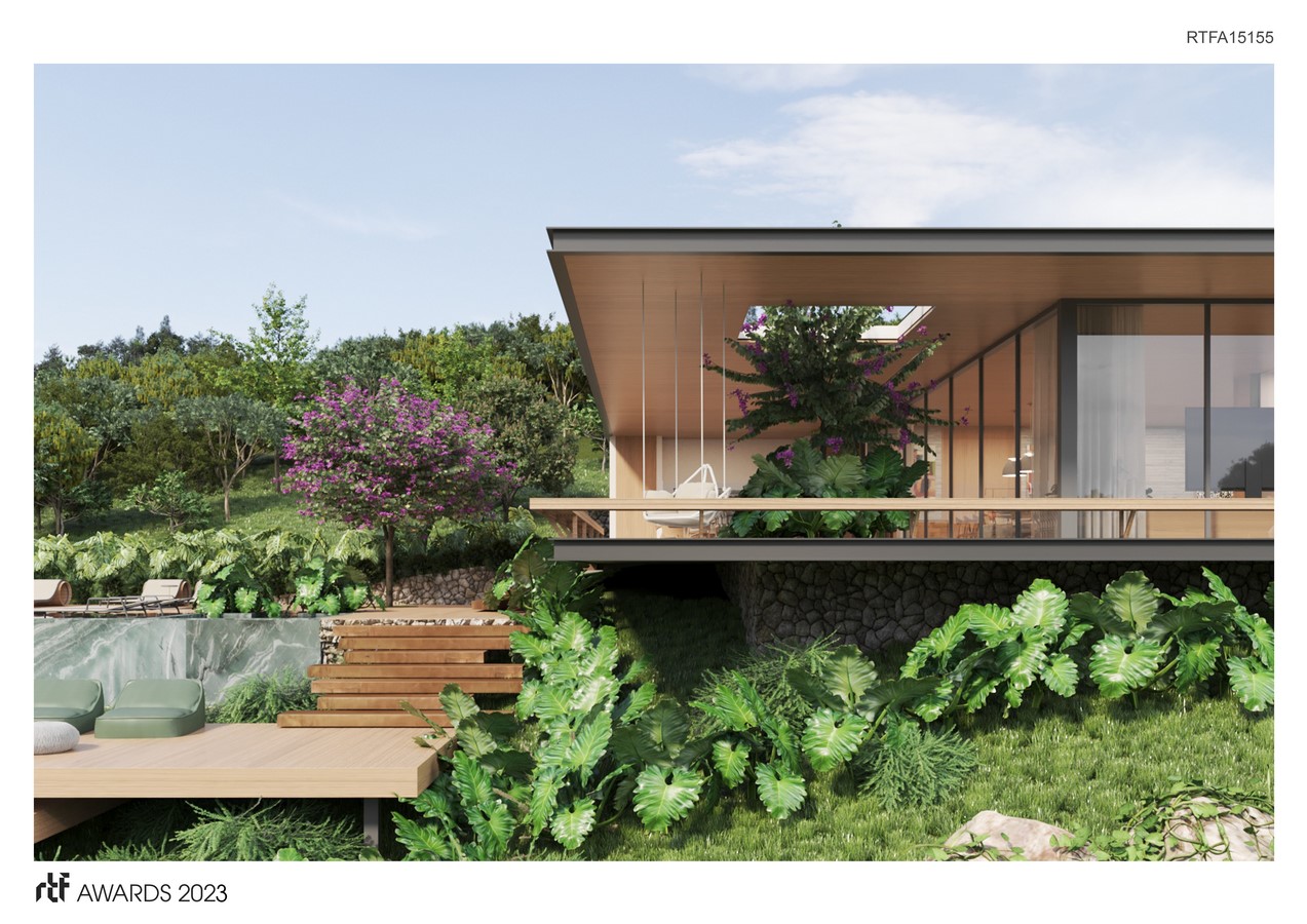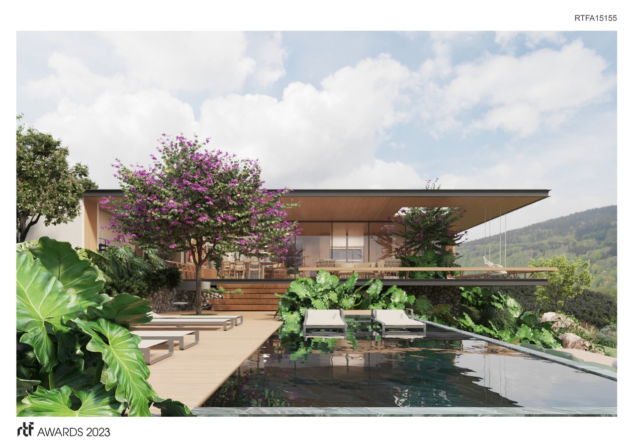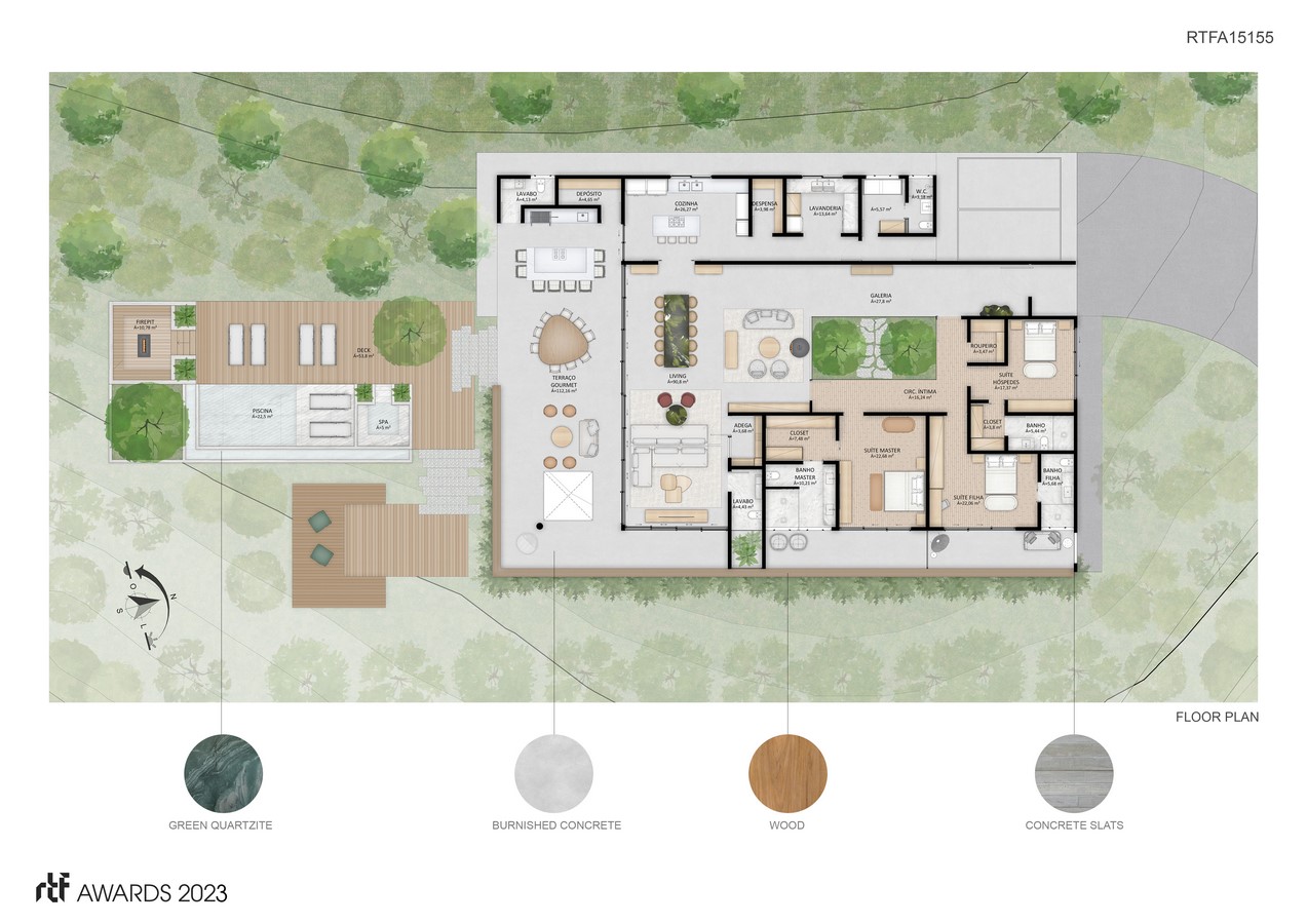 In addition, the Quaresmeiras Residence follows the concepts of biophilia, which is reflected in the presence of an internal garden that acts as a breath of fresh air within the architecture, with cherry trees composing this private contemplation space. The use of natural materials, such as wood, moledo stone, and green quartzite in the pool, is also part of this concept.