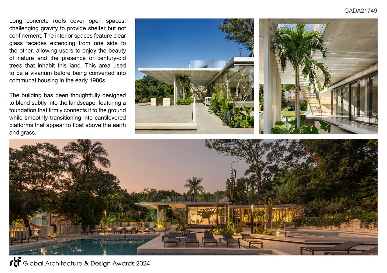 Long concrete roofs cover open spaces, challenging gravity to provide shelter but not confinement. The interior spaces feature clear glass facades extending from one side to the other, allowing users to enjoy the beauty of nature and the presence of century-old trees that inhabit this land. This area used to be a vivarium before being converted into communal housing in the early 1980s.