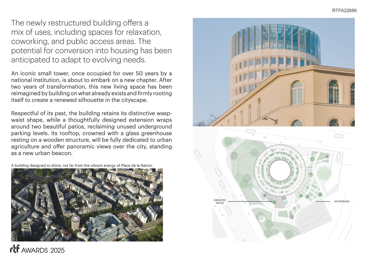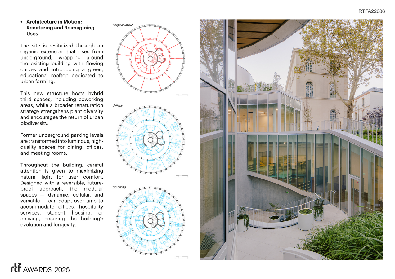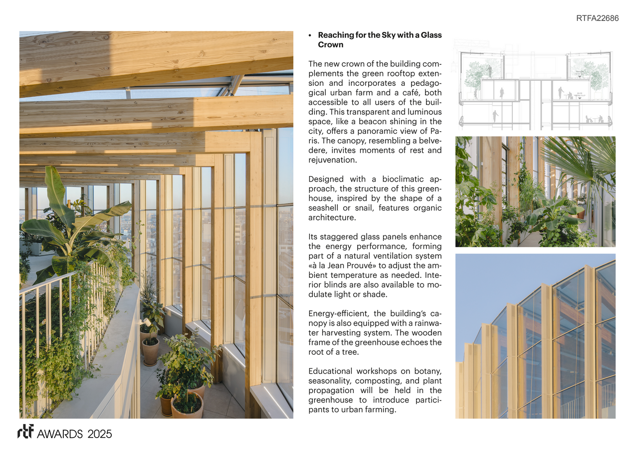By reimagining this historic building, the design team managed to preserve its essence while giving vibrant life into it. The decision to maintain its distinctive silhouette while rethinking its use and adding a contemporary extension reflects a visionary and sensitive approach. This extension, conceived as a scarf elegantly wrapping around the main building, includes two patios revitalized from former underground parking lots and a glass greenhouse on the roof, promoting urban agriculture and offering a panoramic view of the city.