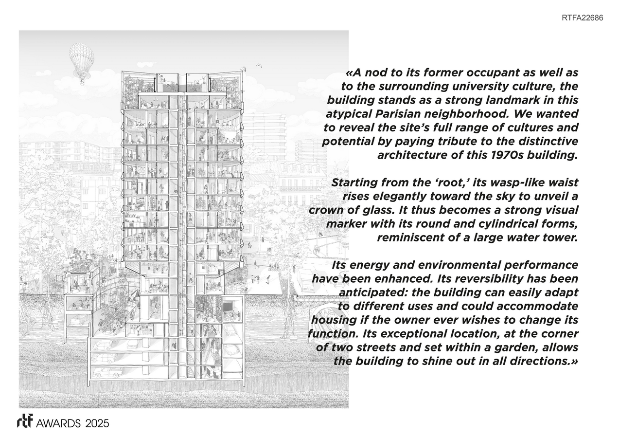 It is a real iconic neighbourhood building that is being rejuvenated. Maud Caubet Architects agency has focused on working with density and heights to emphasize the contemporary aspect of the building. This intervention renews the silhouette of the structure, transforming it into a sort of beacon in the city.