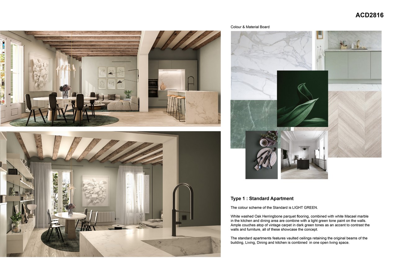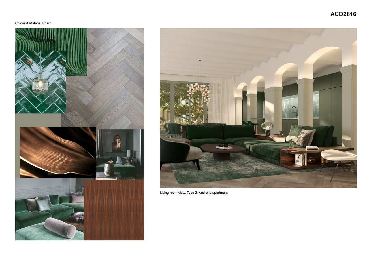 Each apartments material concept is based on a low saturated green which materials are adapted to each type while maintaining the same essence as a visual red thread.