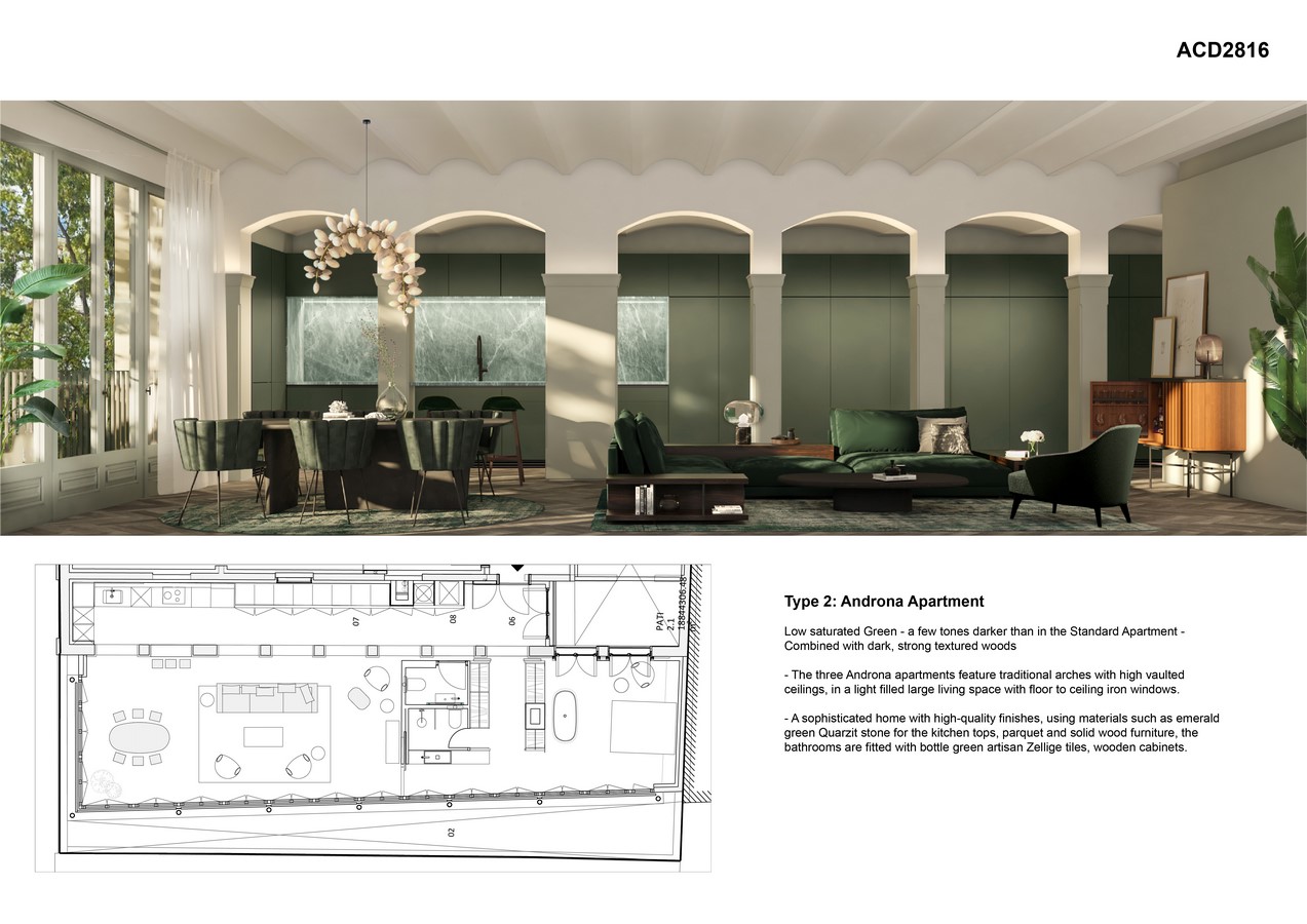 - The three Androna apartments feature traditional arches with high vaulted ceilings, in a light filled large living space with floor to ceiling iron windows.