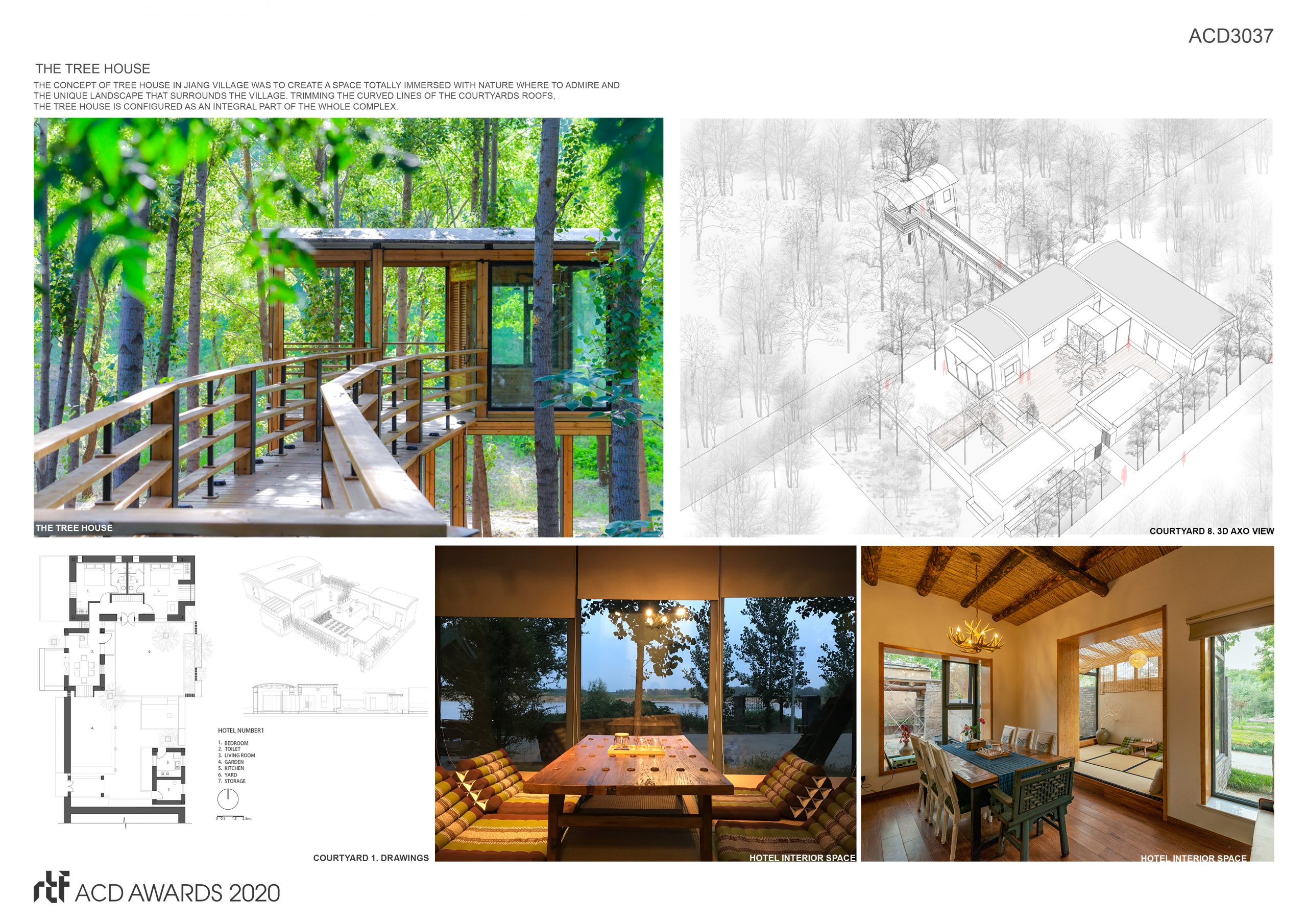 The renovated buildings continue the L-shaped and U-shaped courtyard pattern of local dwellings, maintain the external wall material characteristics of raw soil, brick and bluestone, staggered brick cornice, yellow mud roof and slightly arched wooden frame form, and strengthen the structure of abandoned residential buildings, add internal thermal insulation, increase sanitary rooms, improve the height of indoor space, so as to facilitate natural ventilation and lighting, and make the indoor and outdoor environment melt into one. The villager cultural center is transformed from the sheep pen and pigsty in the village. Its functions include library, country bar, exhibition hall and restaurant, forming three public courtyards in series. The micro arched roof of the tree house in the forest is unified with the folk houses, which is the container of the scenery and a part of the landscape at the same time.As a “rural poverty alleviation” project supported by charitable donation funds, Jiang village makes villagers get the “dividend” from operation and become the main beneficiary, so as to get rid of poverty.