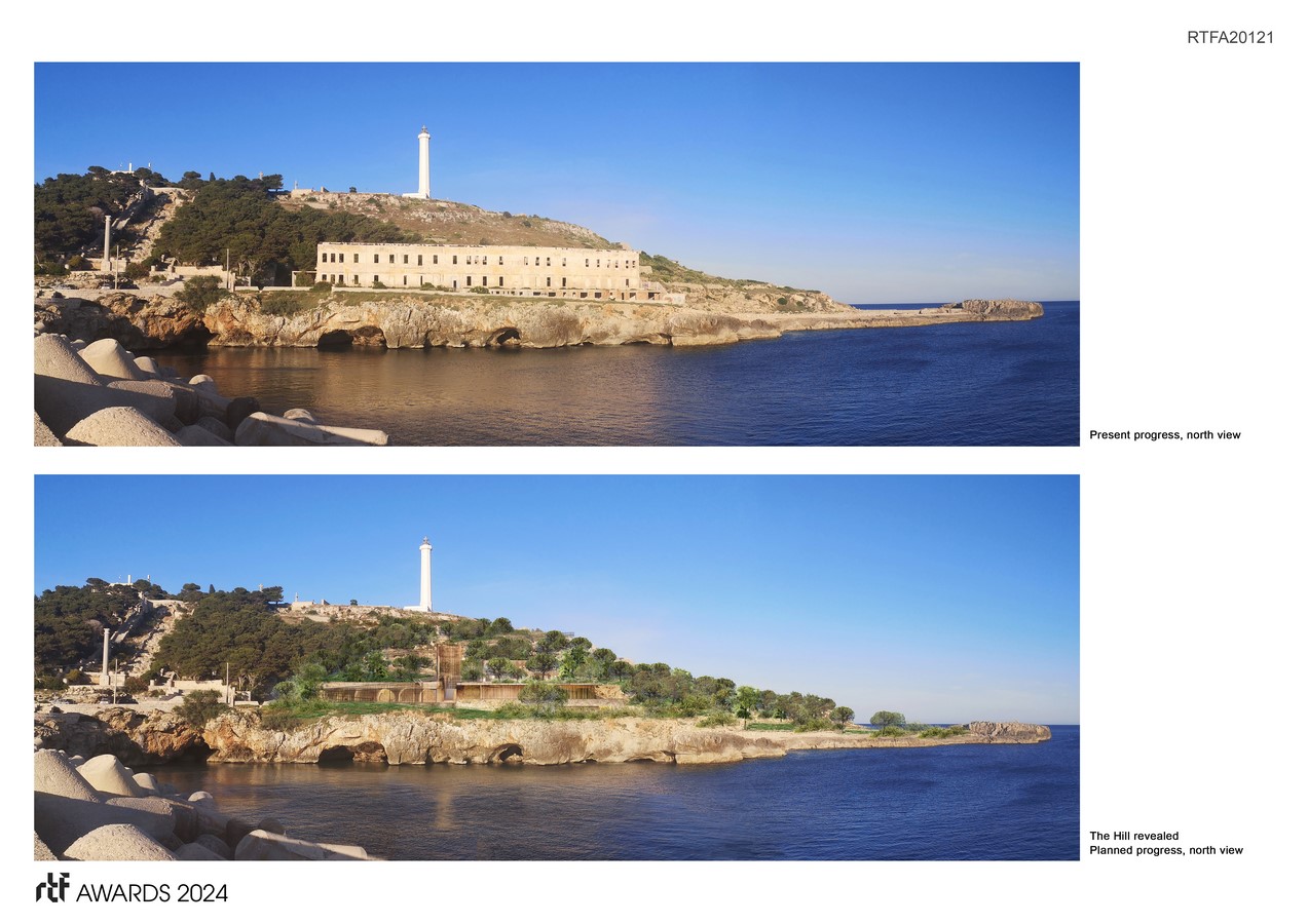 Despite the safety interventions on the building already carried out, further interventions will certainly have to be planned in the short term. Instead of restoring the existing volume, the project plans to drastically reduce it by making the hill reappear, now completely hidden from view, an intervention where the architecture dialogues, integrates, merges with the landscape: the main objective becomes the environmental recovery of Punta Meliso.