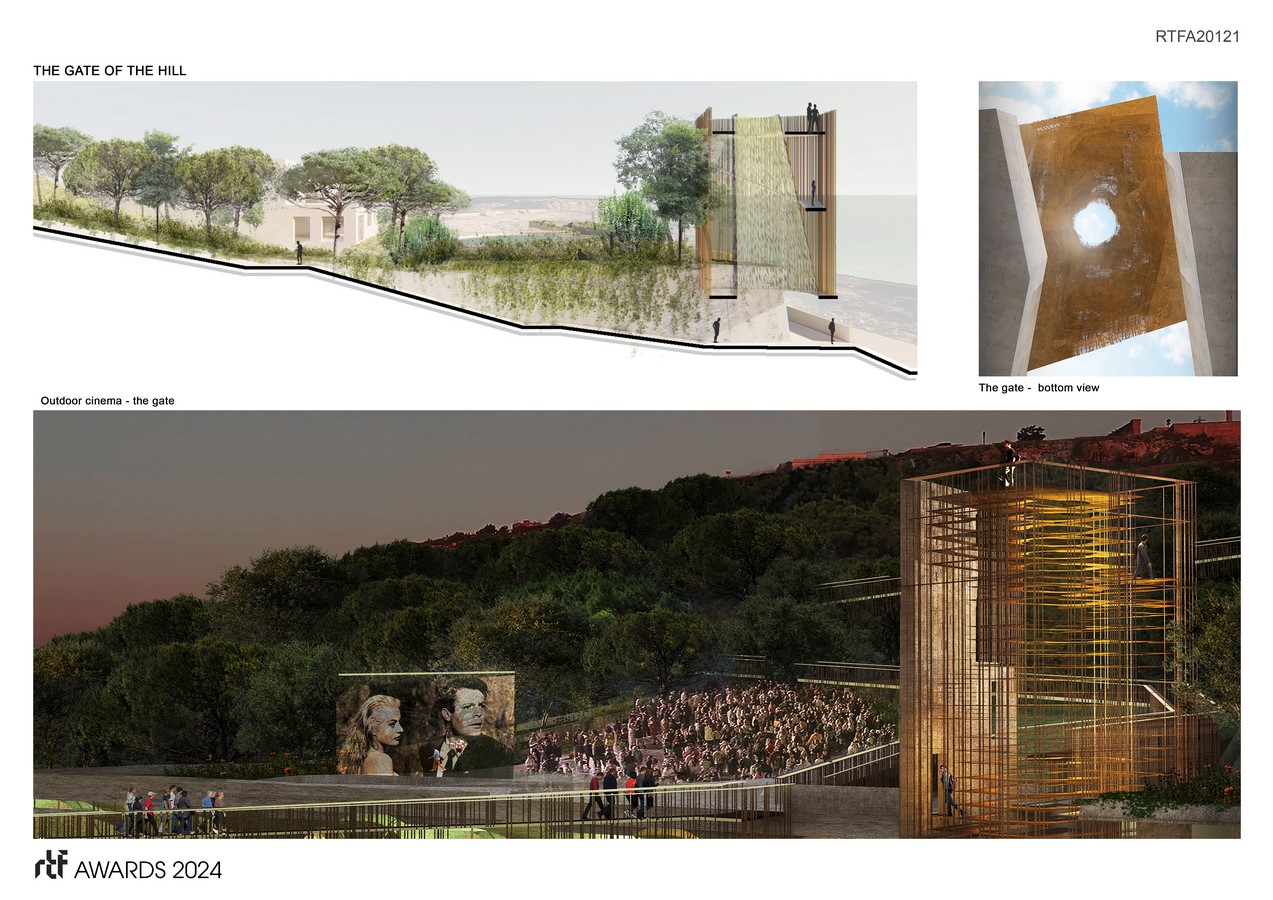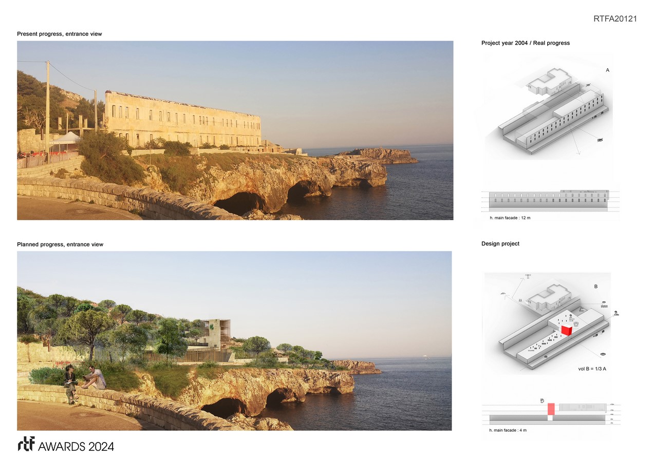 The remaining part of the former Colony remains accessible to the public and is being recovered as a Sea Museum, proposed as an active cultural project rather than as a space for conserving finds, a place that will make available everything that is human intelligence has proposed in a creative form on the theme of the sea and travel: documentaries, films, sound recordings, within a program of activities that will develop in the spirit of the cultural indications proposed by the Puglia Region. In the recovered landscape, a single element stands out, a tower with great symbolic value, whose height is a reminder of the size of the former colony, a volume which we choose to give up. The tower recalls an identifying sign of the Salento coastal landscape, but it is also the gateway to the hill above, which we want to make usable not only as a walk, but also by expanding, through a botanical restoration, the tree-lined part so as to form a forest which with its shade offers shelter from the scorching summer sun.