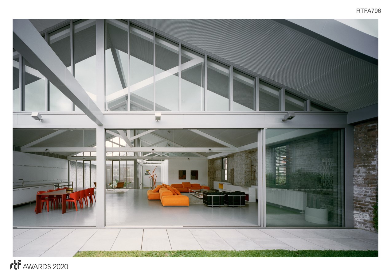 This adaptive reuse of a former warehouse has maintained the exterior almost untouched, with only a few new windows inserted into existing openings. This soft-touch has been extended to the interior, where original brick walls have been exposed and the large timber roof trusses highlighted as the starting point for the conversion to a family home.