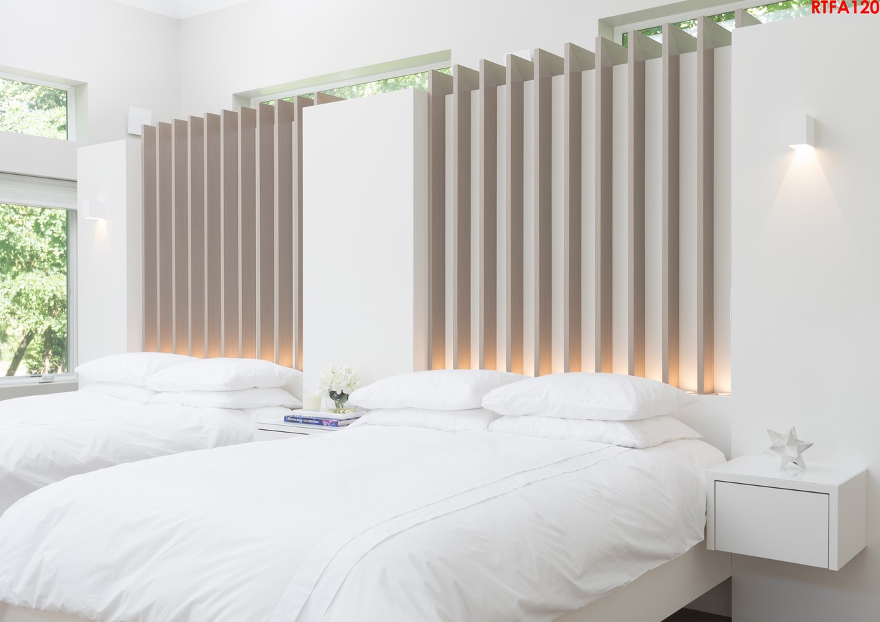 Between them, natural wood slats rise from the beds and disappear over the top of this freestanding wall. Pin lights between the slats illuminate the design. Nightstands seem to float from the columns while understated white sconces blend right in. Concealed behind this structure is a full custom closet, marrying beauty and function.