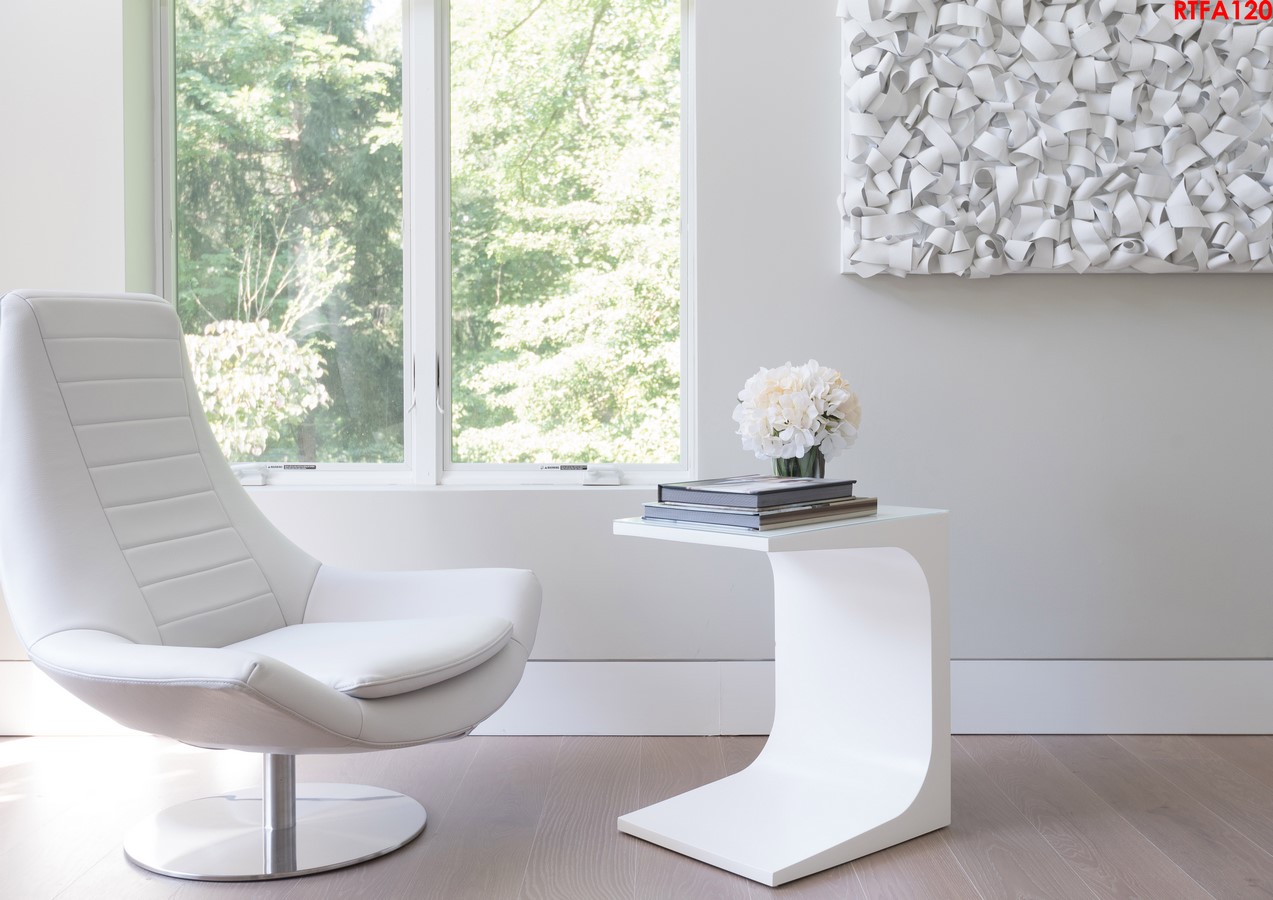 This contemporary home is a wonder in black and white, accented by a bold color display. The entire first floor features no profiled base molding; rather, a concealed trim is recessed into the wall, leaving the entire wall and base flush. Defining the two is a sharp channel finished in polished chrome.