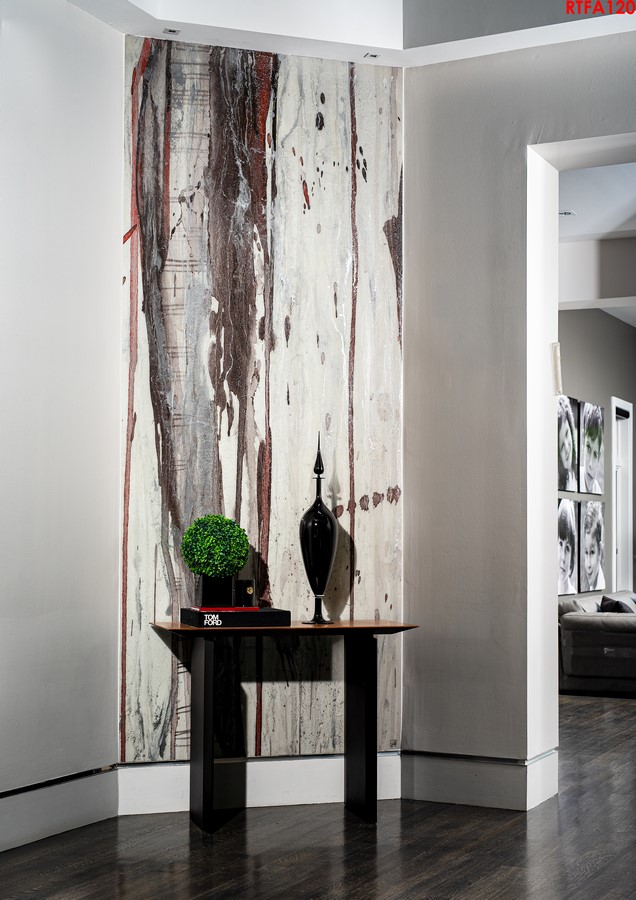 The metal weaves in and out of the main floor spaces, lending linearity and continuity to the home. The wide wood flooring is stained in a deep walnut finish- a sharp contrast to the airy walls. In the entry, one wall is treated with a textured epoxy covering. The larger than life art installation incorporates color in a striking way. It is perfectly accented by a sleek black console and Joe Cariati glass decanter.