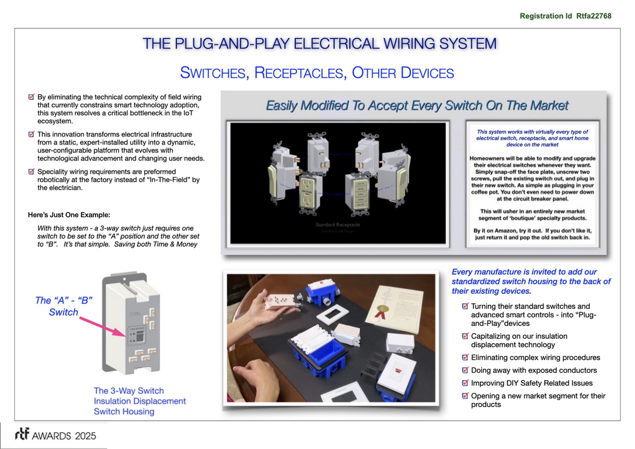 This represents not merely an incremental improvement but a paradigm shift in how we conceptualize, install, and interact with electrical systems – creating a universal language of connectivity that will power the next generation of built environments. Material costs are close to net neutral, initial installation costs are dramatically reduced, and installation training requirements are negligible. The inventor of this patented wiring system plans to release it to all OEMs as an “Open Source” “no cost” technology.