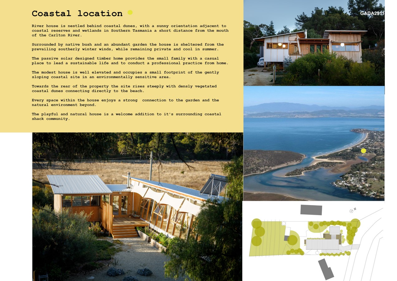 In 2012 the owners, a couple and their young daughter, purchased the parcel of land with the intention of building a modest home for their small family designed according to passive solar principles. They were attracted to the site because of its coastal location, the protection from prevailing winds provided by the coastal dunes and its sunny northerly aspect. The site is situated on the fringe of a low density residential area and is framed by coastal vegetation with views across the adjacent wetland near the mouth of the Carlton River in southern Tasmania.