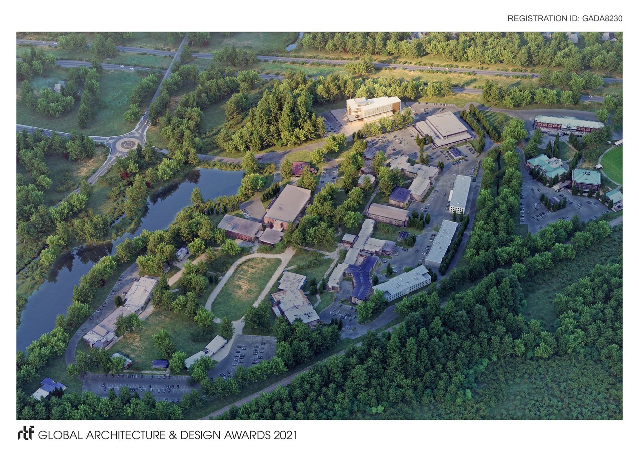 Upon entering the building, a four-storey ovalized central atrium organizes the program, with learning spaces – both traditional and informal – adjacent to the atrium. All programmed areas take advantage of natural light and views out to the campus to support the health and well-being of occupants.