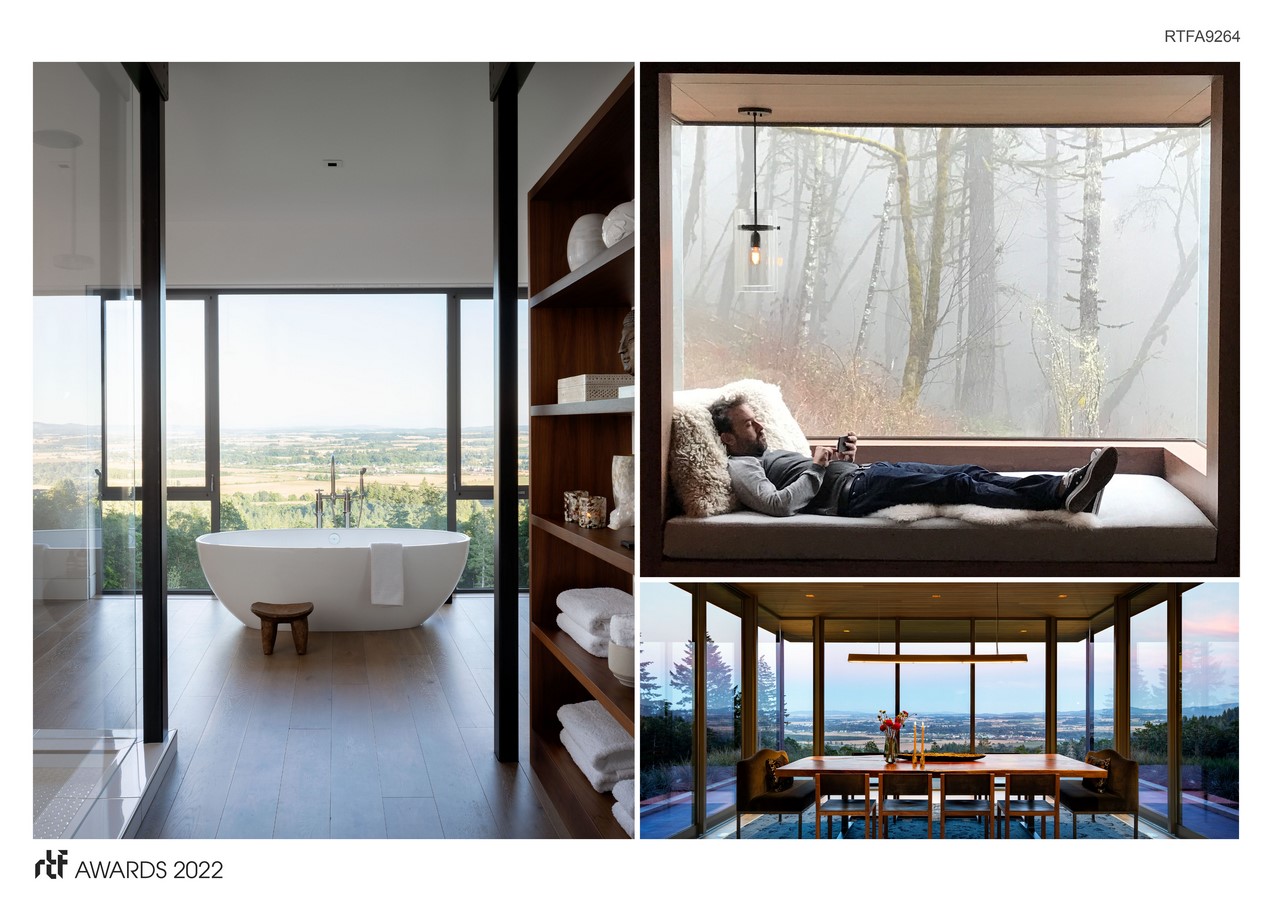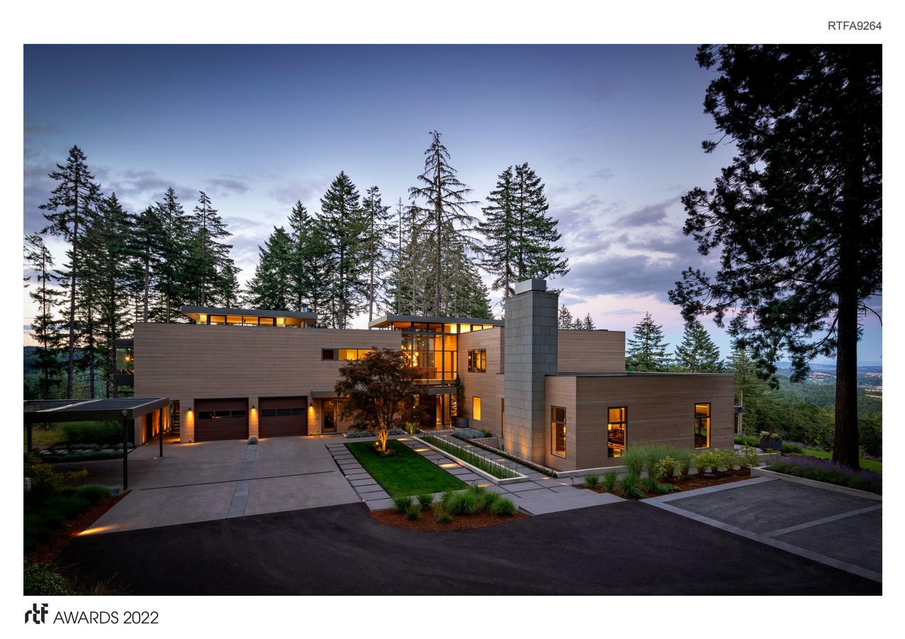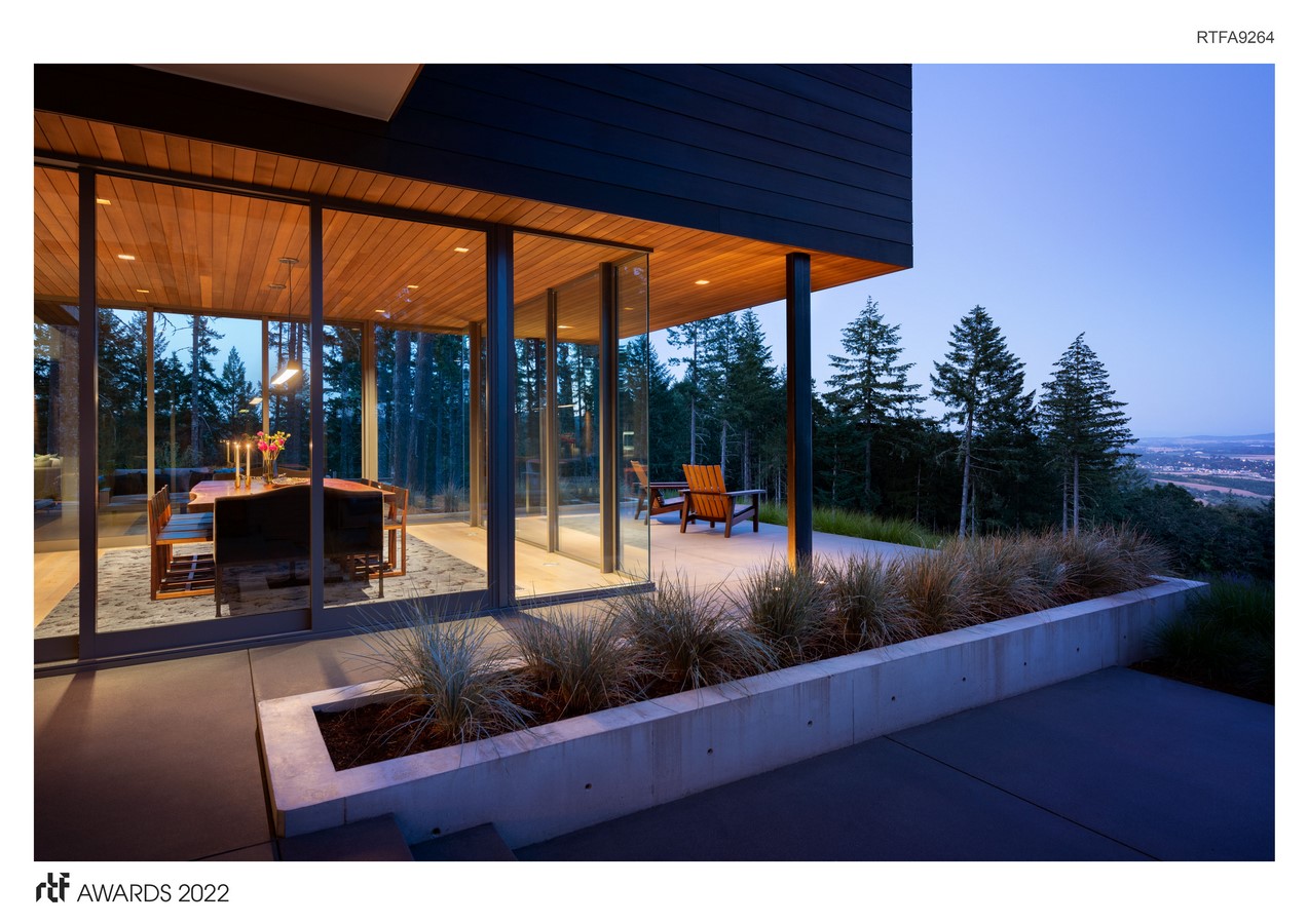 Set into the picturesque backdrop of Oregon’s wine country, the hillside property enjoys scenic views of the Willamette Valley wine country from the edge of a layered grove of Douglas fir trees.