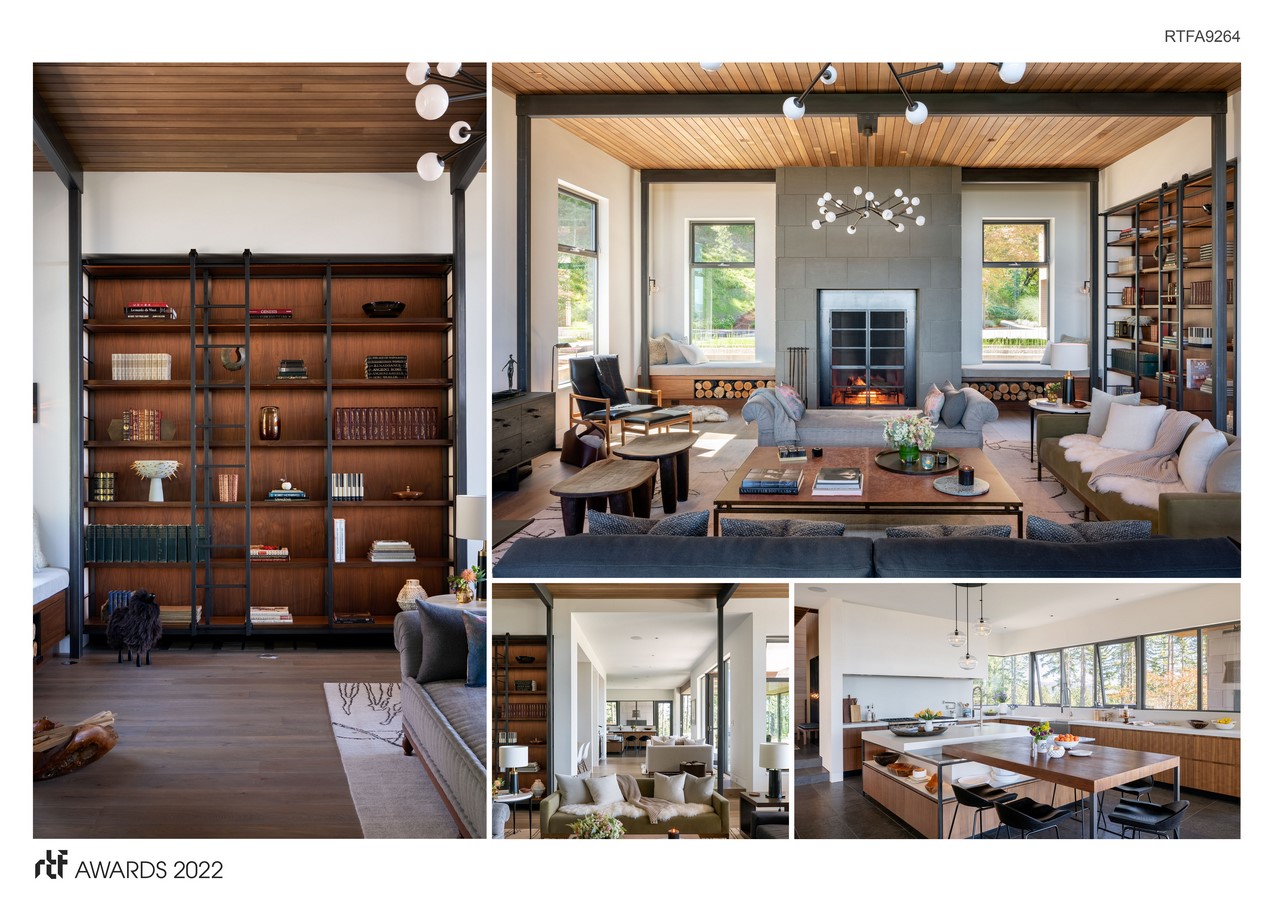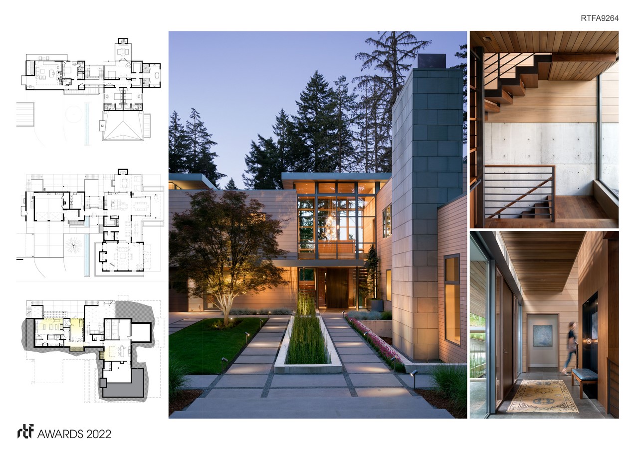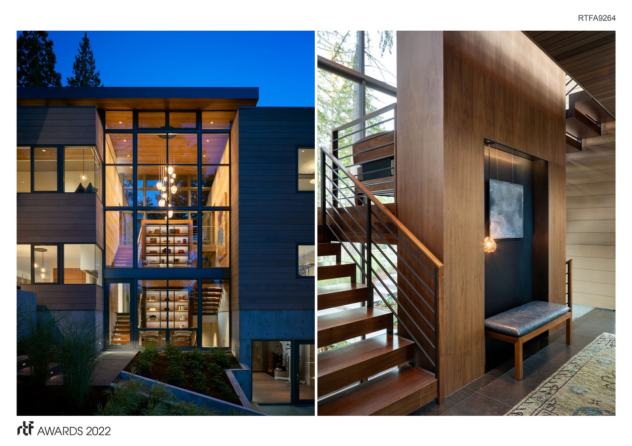 The home is two separate wings, connected by a glass entry volume. A multi-story stair library with reading platforms is at its heart. It embraces the natural surroundings allowing one to feel perched in the surrounding woods of the natural outdoors.
