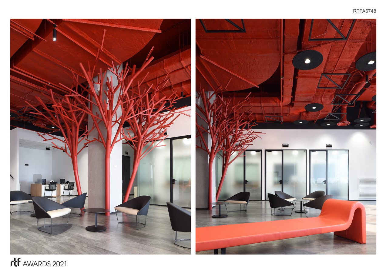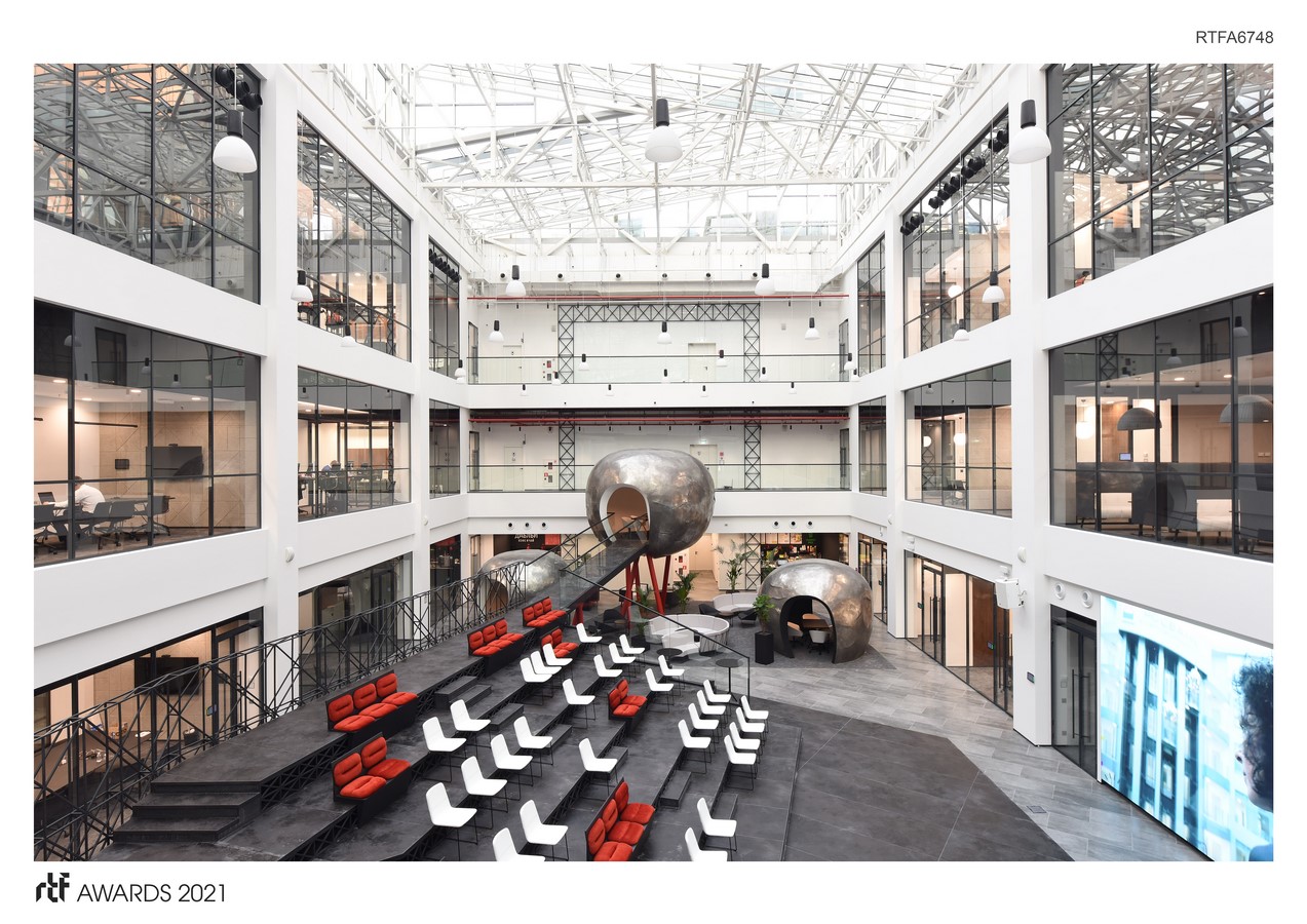 The semantic center of the office is a multi-colored atrium, which unites different functional areas created to solve various communication tasks.