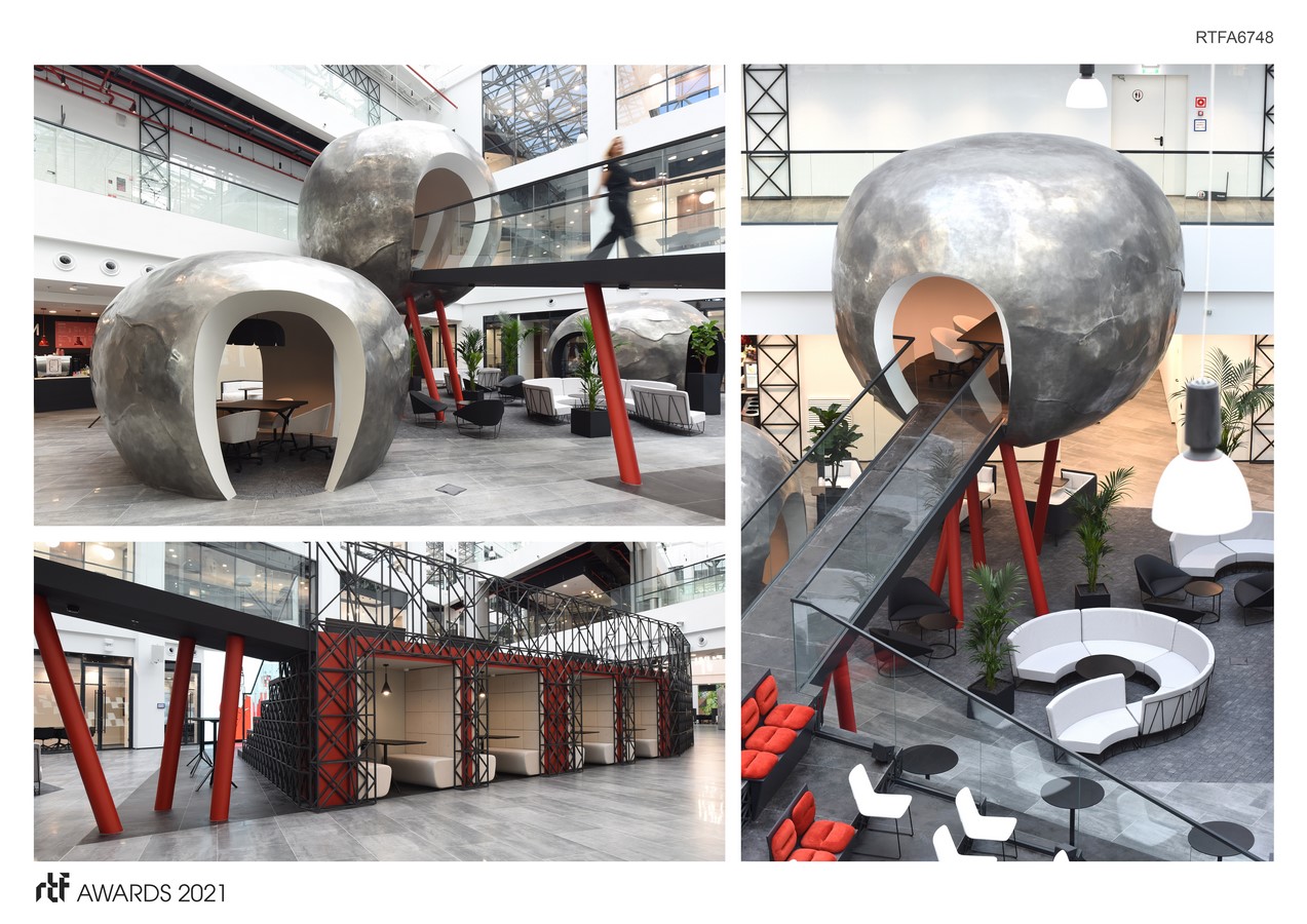 The metal ball-shaped meeting rooms in the atrium also have French stylistic origins – fancy steel structures from the famous Georges Pompidou Center in Paris.