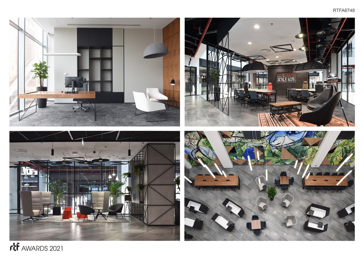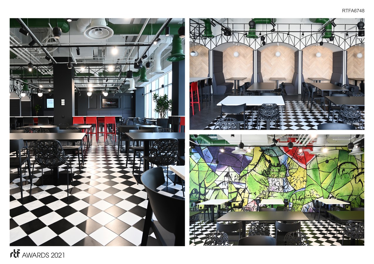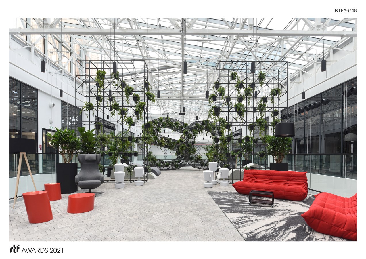 The Agile Hub area is located on the semi-open balcony overlooking the atrium. The uppermost level, directly under the glass roof, occupies a well-thought-out space for relaxation: upholstered furniture, an abundance of greenery and the opportunity to look at the endless sky are created for an emotional reboot and an opportunity to recharge with energy and inspiration.