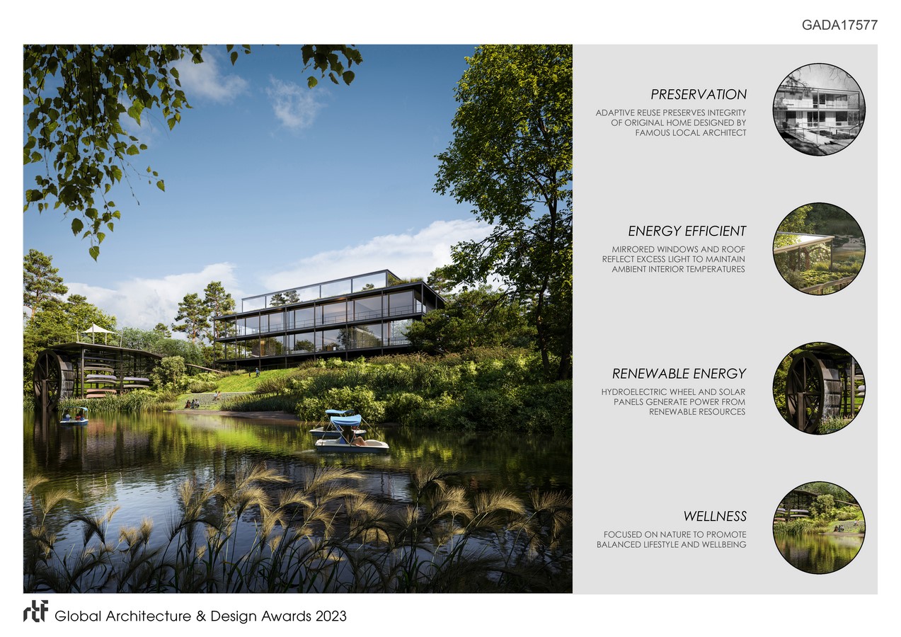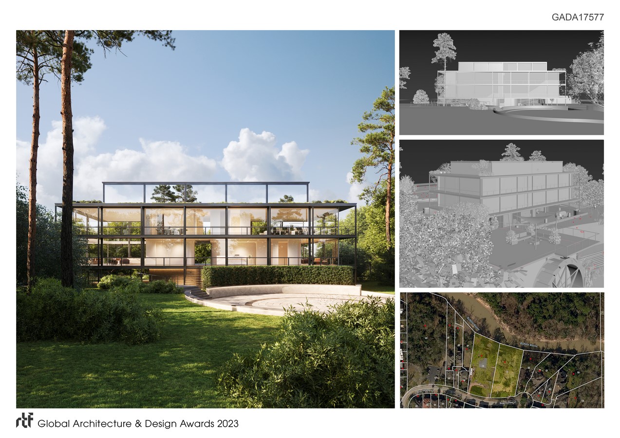 Expanding the plan vertically, the design team incorporated a third story lounge and indoor/outdoor entertainment space. The team cleverly incorporated mirrored surfaces on the windows and rooftop to reflect the natural environment and create the illusion of invisibility since the third level was not part of the original architectural drawings and they wanted to remain true to the original vision. These mirrored panels sere a double purpose as they also naturally reflect light away from the space, which help maintain a more comfortable interior temperature and reduce the need for air conditioning. Further to this green initiative, plans also include solar panels and a hydroelectric wheel that will generate and store enough electricity to power the adjacent “boat house”—a small structure along the bank intended to store paddle boats for leisure cruises down the bayou.