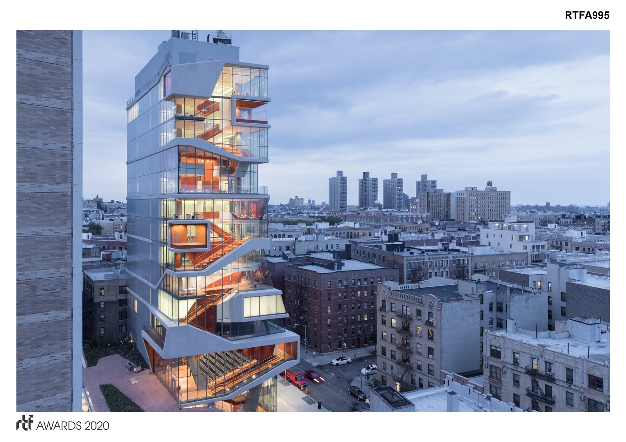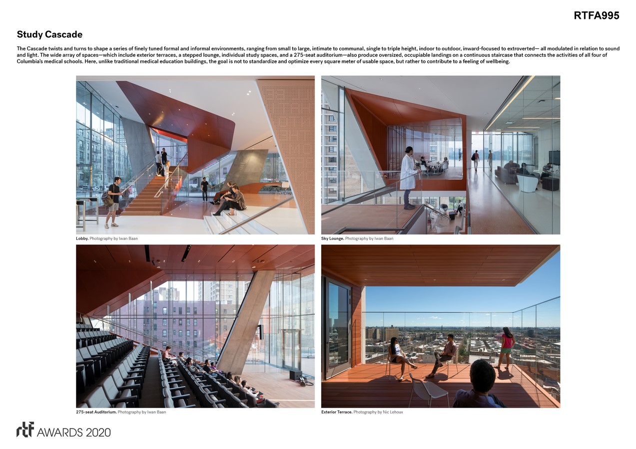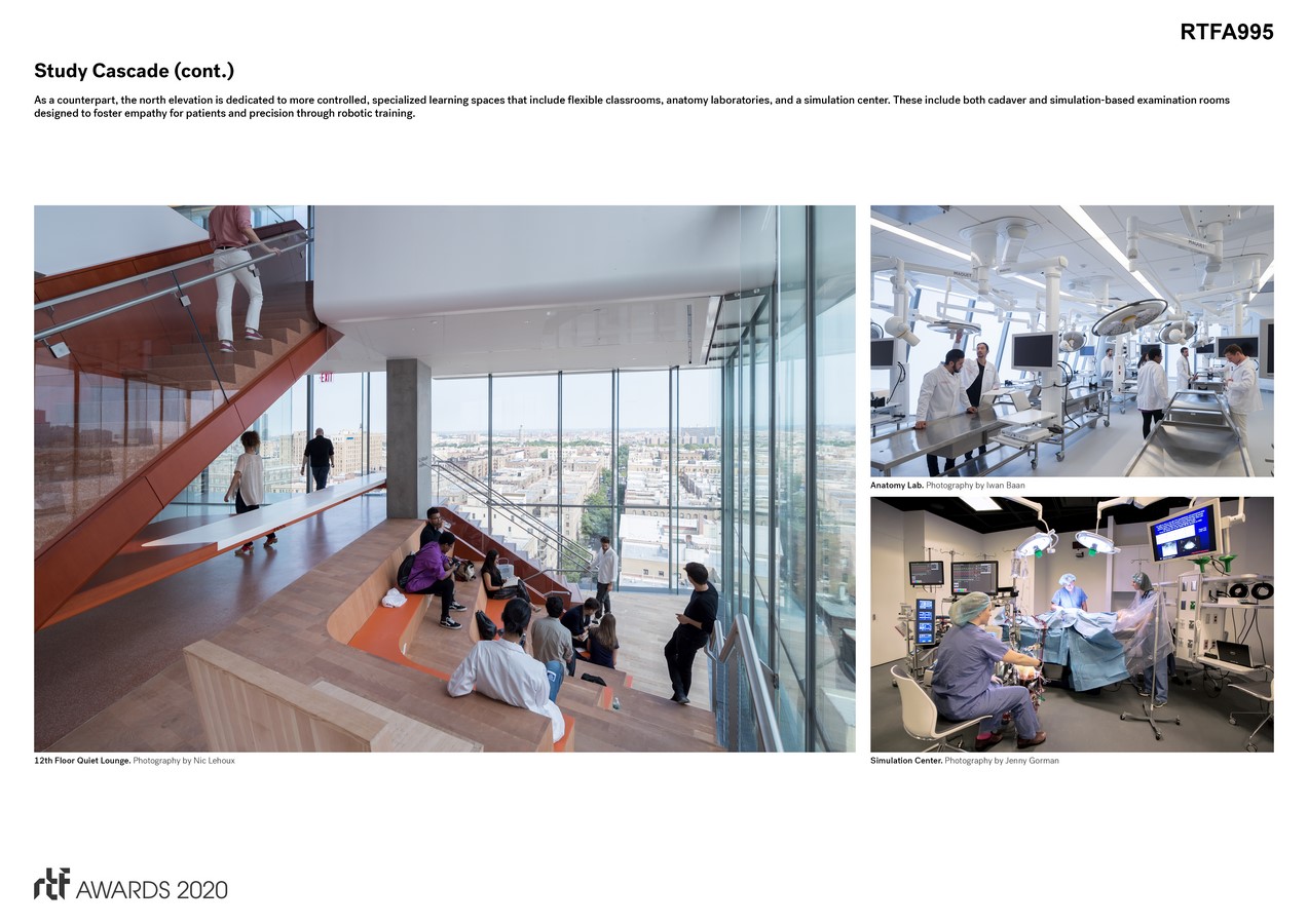 Completed in 2016, the building reflects a paradigm shift in medical education from passive, lecture-based instruction to team-based problem solving, while simultaneously responding to the site’s narrow footprint and tapered zoning envelope. Its defining feature is the ‘Study Cascade,’ an interconnected network of exuberant, airy, and light-filled spaces that extend from the street up the façade of the 14-story building.