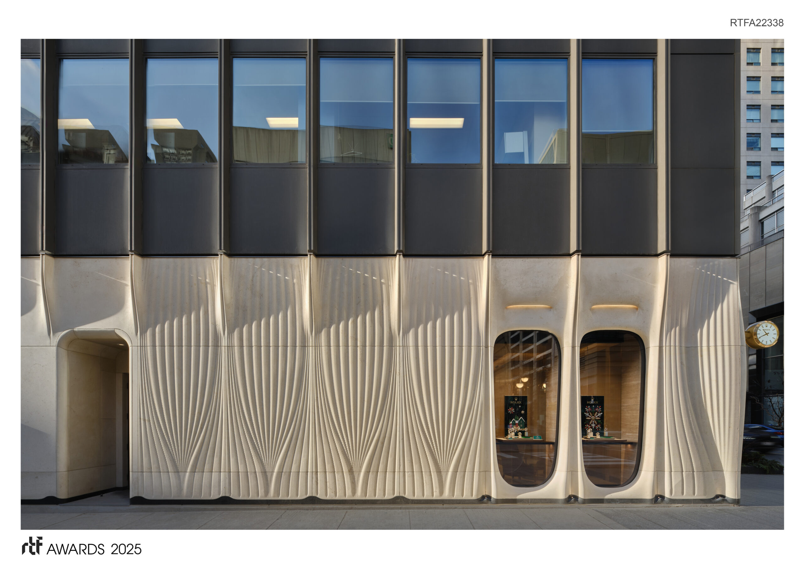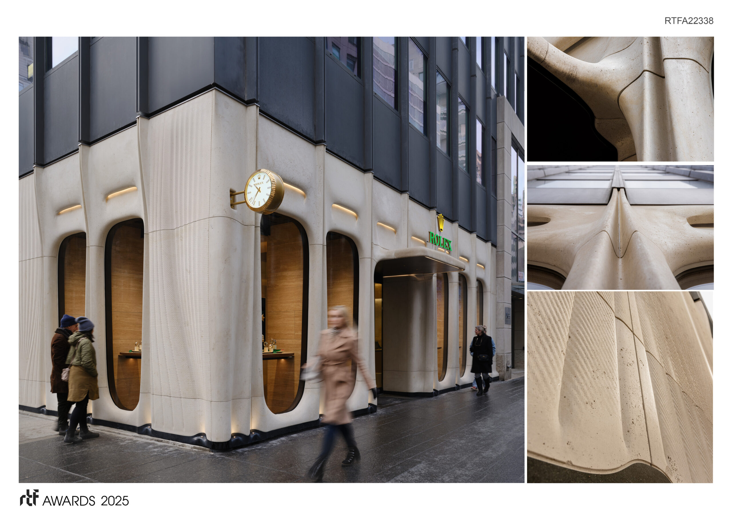 At the intersection of technology and craft, the geometries of the watch are translated into architecture through the exploration of limestone, a durable and sustainable material. The seemingly brutal material is transformed into a delicate and airy medium through elegant contours and smooth bends. The language of the existing modernist façade is seamlessly integrated down into the mullions of the storefront, where the rhythm of the columns recalls the patterns of a watch’s band links, and curvilinear windows reflect polished watch crystals. As the mullions trace down the exterior of the high-rise, they begin to slowly bend into subtle, graceful arcs that capture the essence between the existing structure and the distinctive Rolex geometries.