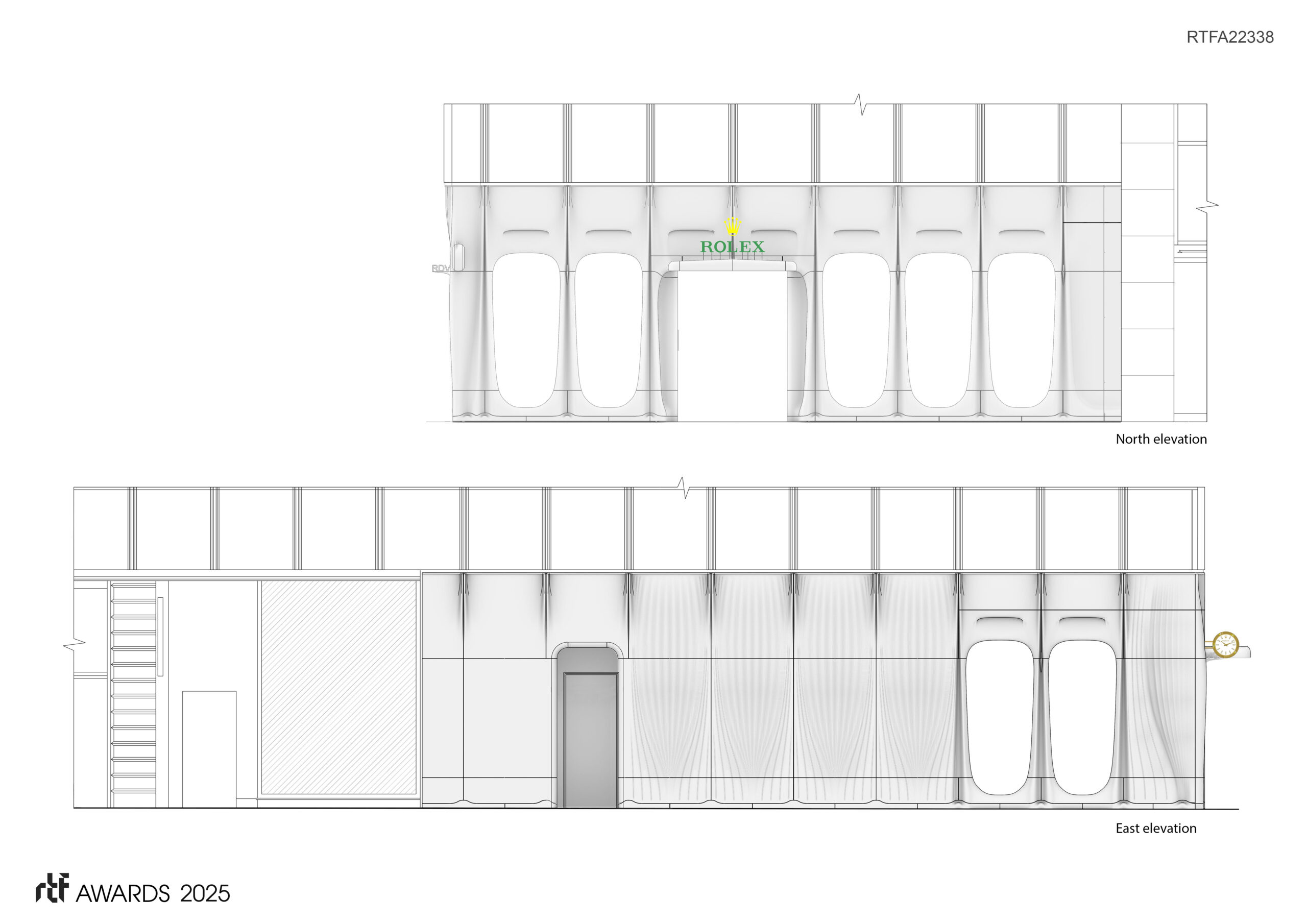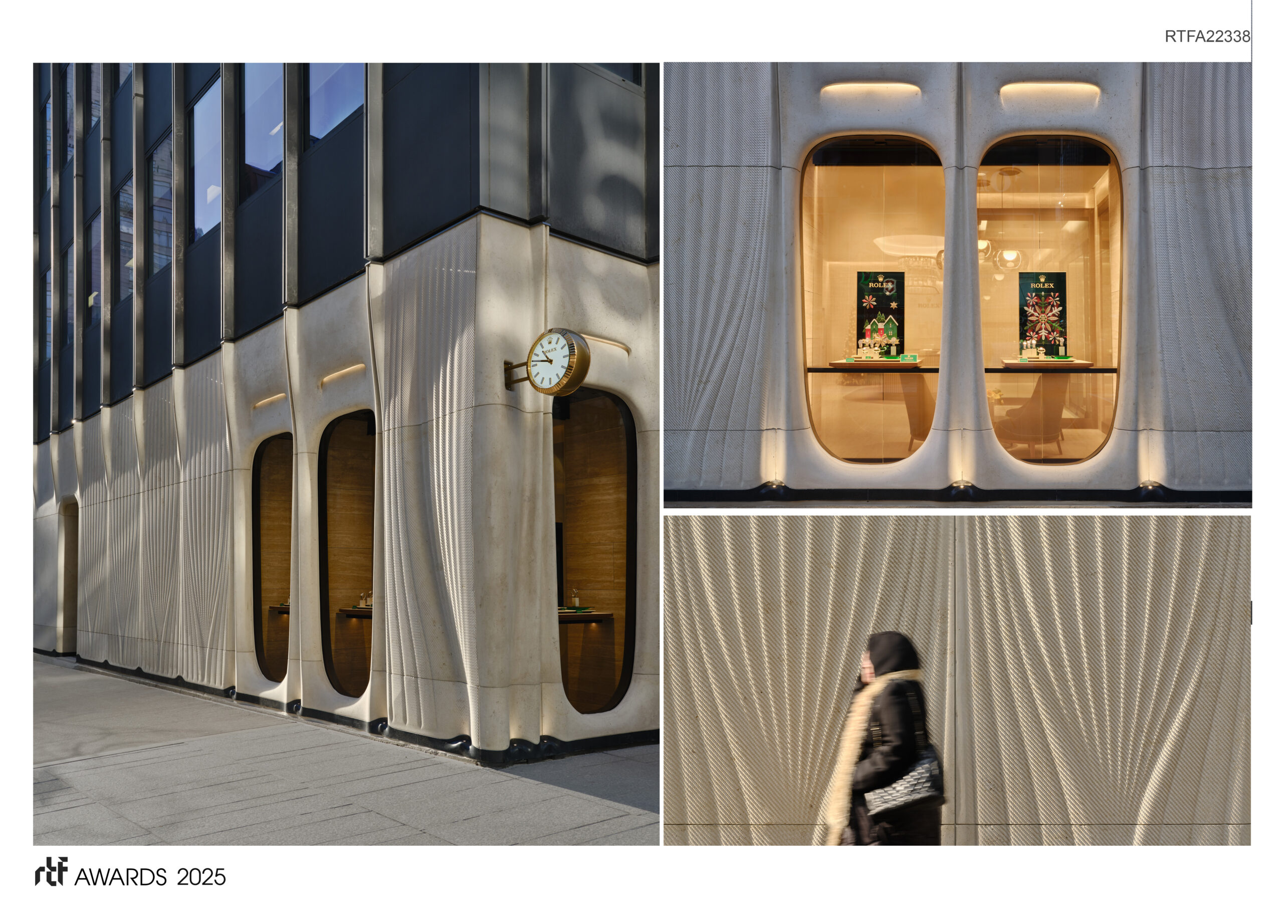 The Rolex Boutique’s façade boasts a harmonious integration of innovative materials that capture the essence of Rolex’s quintessential design and craft. At the same time, the façade anticipates and responds to future-forward needs that accommodate changing values, all while adapting to the city’s existing infrastructure, redefining the future of heritage.