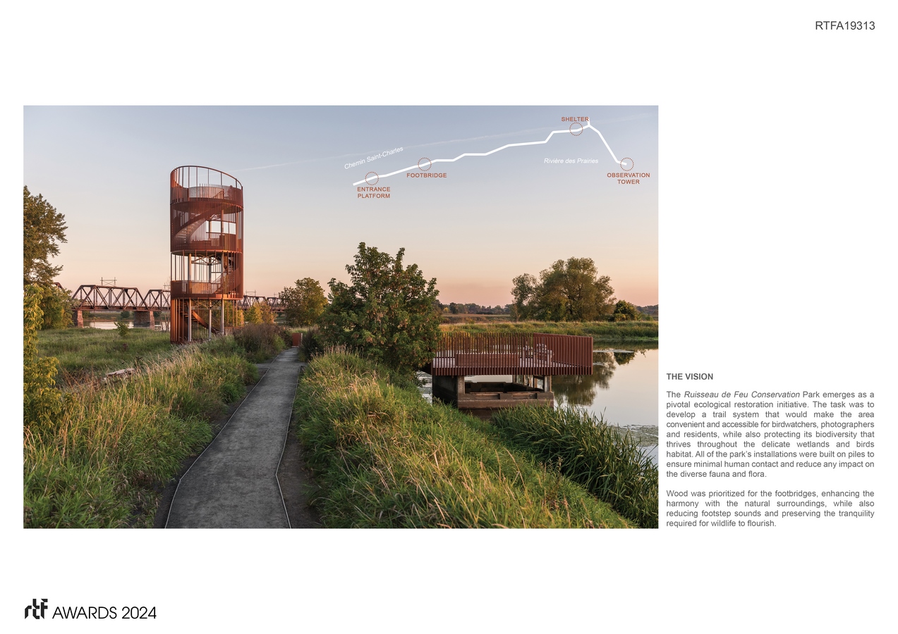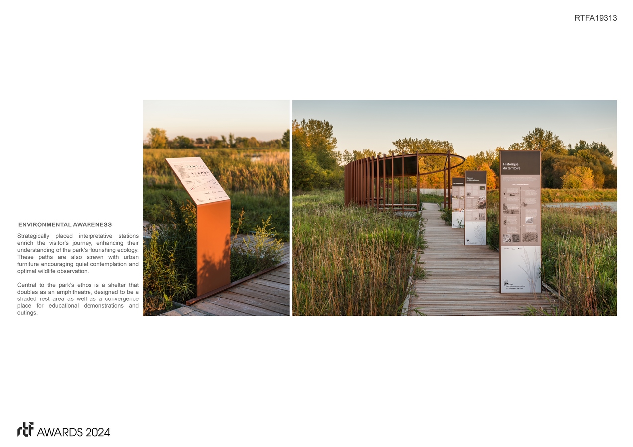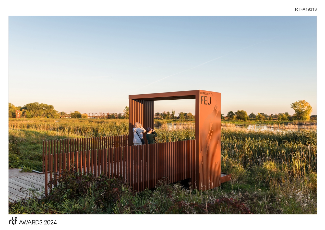 It provides stunning views of diverse and rich ecosystems — marshes, meadows and rivers — and aims to foster eco-friendly tourism. Work involved different instances and was done in collaboration with Duck Unlimited Canada as well as the Canadian Ministry of the Environment and the Fight Against Climate Change. Accessibility and preservation of the delicate wetlands and avian life, especially migratory birds, were central to its design.