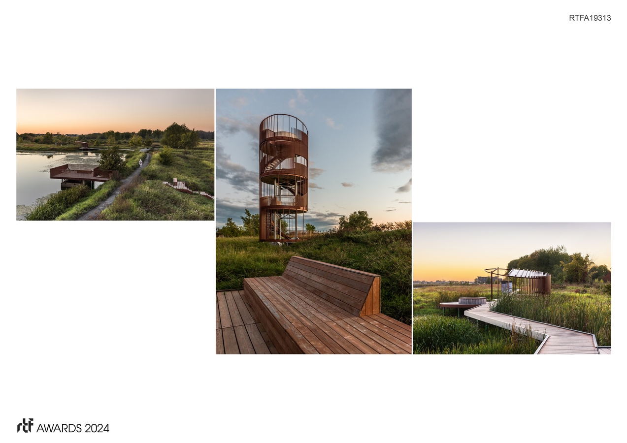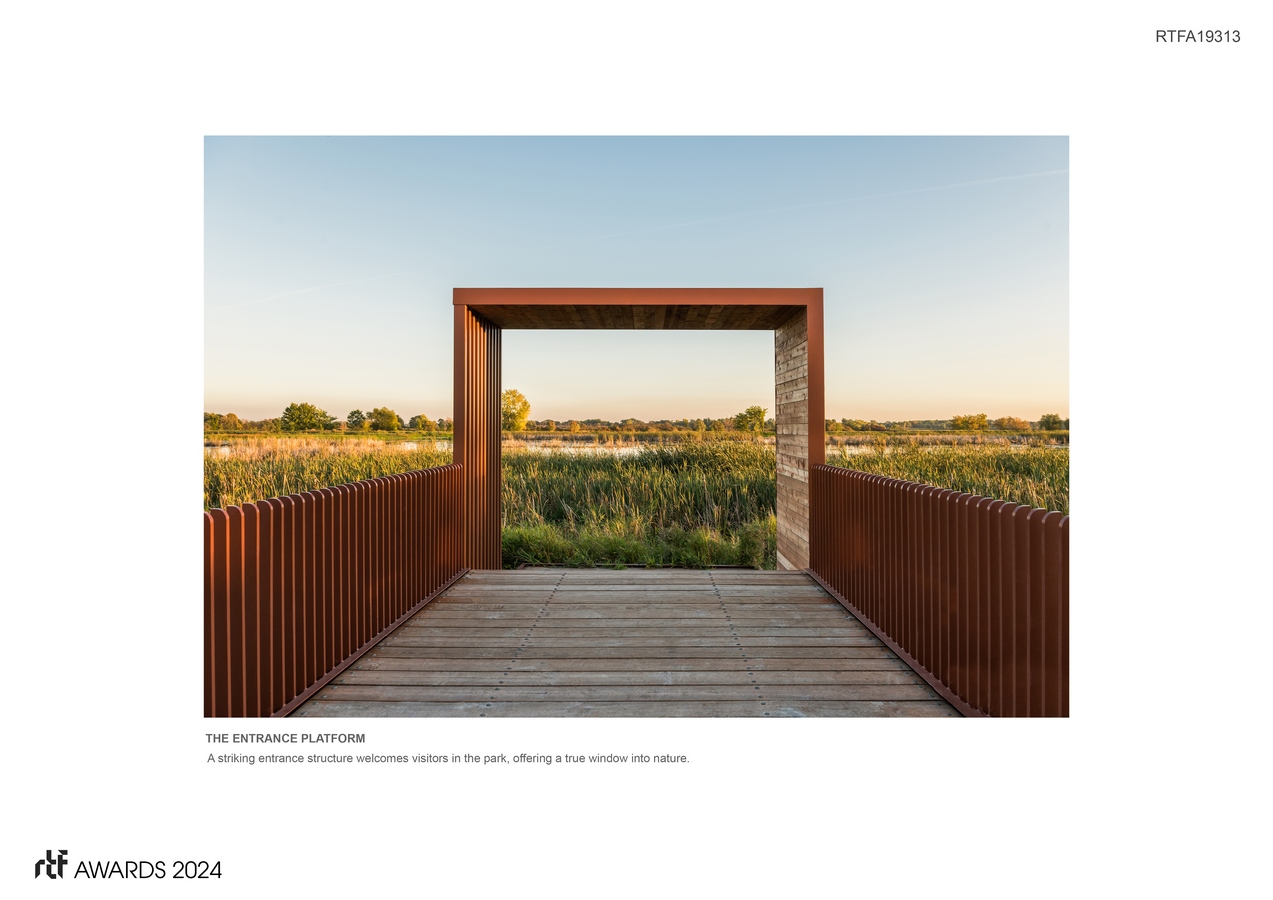 Adjacent to residential neighborhoods and linked by a bike path, the park’s facilities were crafted to allow birdwatchers, photographers and residents alike to circulate freely. The vision was to establish a sanctuary, where human activity harmonizes with the natural environment. This led to the striking entrance structure, offering a true window into nature. Additionally, the park features strategically positioned urban furniture, providing spots for relaxation and optimal wildlife observation.