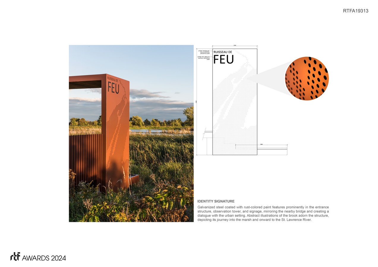 The infrastructures constructed on piles, such as footbridges, serve as the main solution to minimize any impact on the local fauna and flora. The piles allow both animals and plants to circulate across the paths without impediments and make the park accessible to humans regardless of fluctuating water levels below. Interpretive stations further enrich visitors’ understanding of the surrounding environment. Using wood in constructing the footbridges not only blends them seamlessly into the landscape but also mitigates noise from footsteps, reducing disturbance to wildlife. The entrance platform, observation tower, and signage all feature galvanized steel coated in rust-colored paint, echoing the aesthetic of the bridge backdrop.