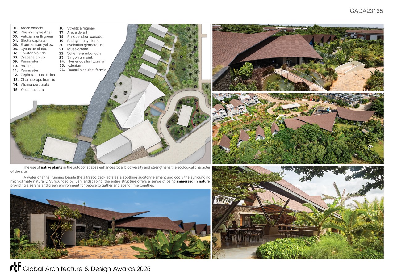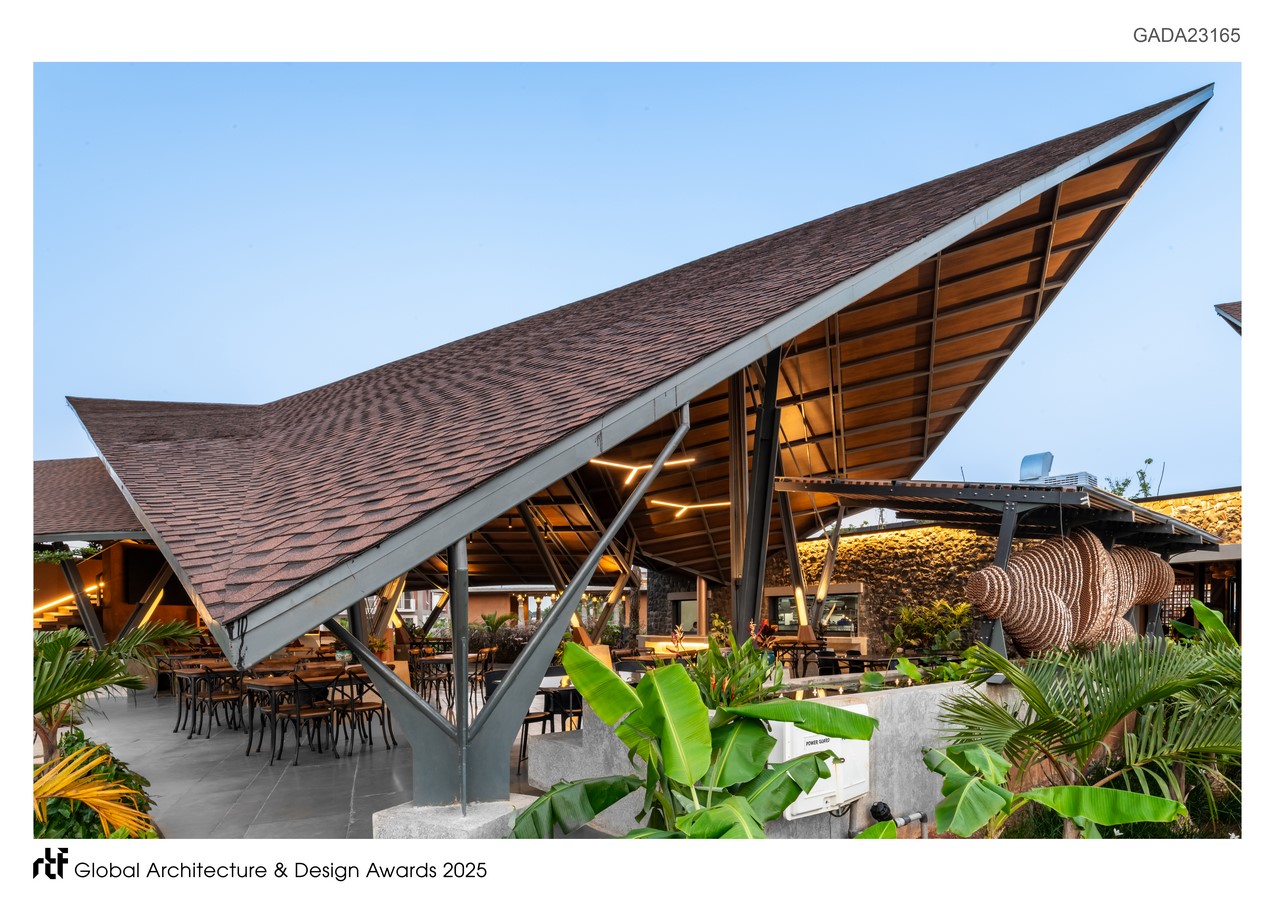 The architecture draws inspiration from traditional pitched-roof huts, reinterpreted into two overlapping sloped roofs poised lightly on slender steel columns. This creates a structure that feels open, airy, and naturally ventilated—anchored in tradition yet unmistakably contemporary. The overlapping roofs allow a stack effect to escape the warm air and make the alfresco and open programs more conducive with evaporative cooling.