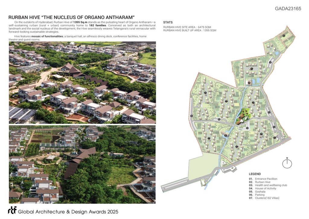 On the outskirts of Hyderabad, Rurban Hive of 1355 Sq.m stands as the pulsating heart of Organo Antharam—a self-sustaining rurban (rural + urban) community home to 182 families. Conceived as both an architectural landmark and the social nucleus of the development, the Hive seamlessly weaves Telangana’s rural vernacular with forward-looking sustainable strategies.