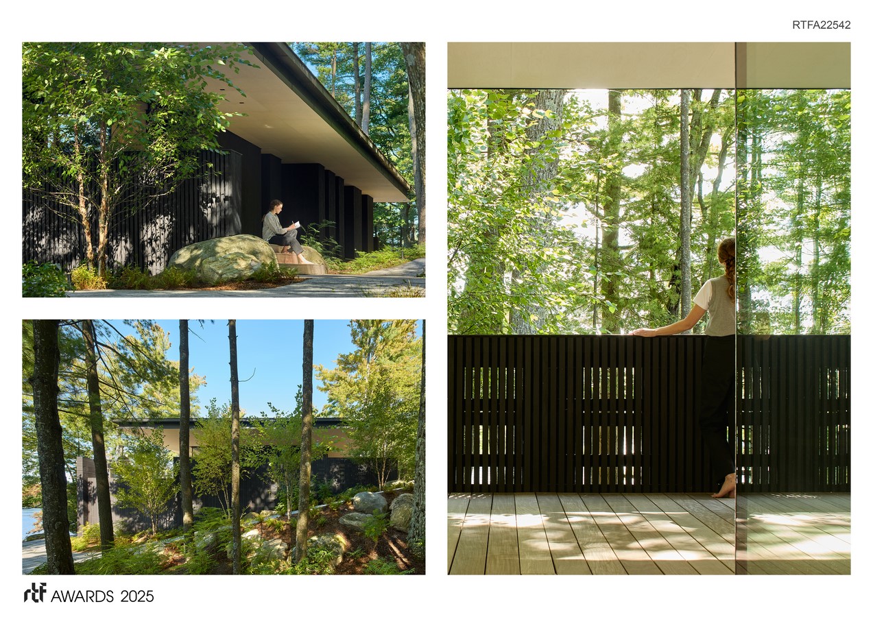 The design preserves mature trees and natural bedrock by situating the building within an existing clearing. The result is a cottage of tension and poetry—expansive yet enclosed, striking yet discreet—where architecture dissolves into nature, fostering retreat and renewal in harmony with the landscape.
