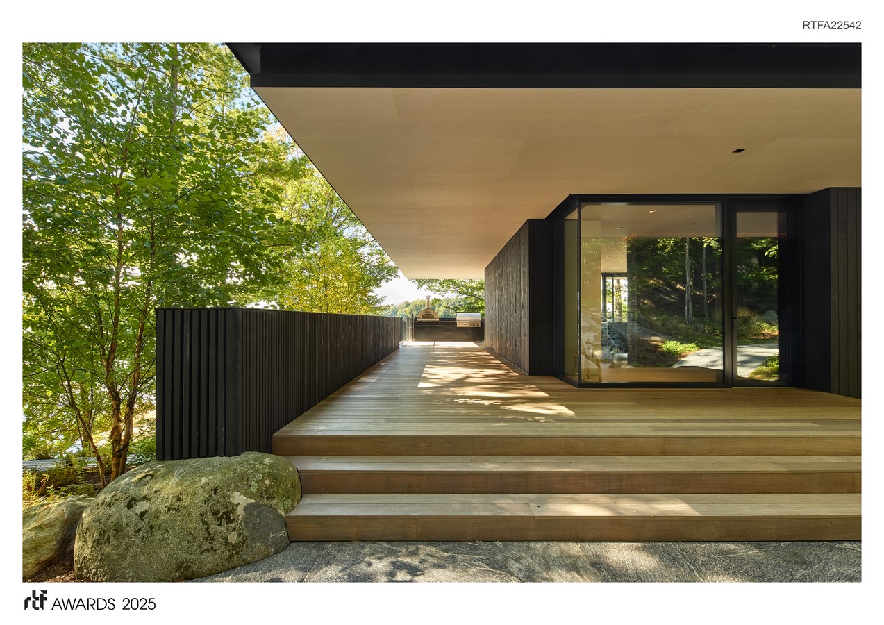 Inspired by floating docks typical of this clearwater lake region, the cottage is envisioned as a series of planar elements unified by a flat rooftop that hovers above the recessive elevations. This interplay of planes offers visual privacy without sacrificing access to lake views, embracing a reductive approach to form and materiality. The design follows the terrain’s natural slope, allowing the lower-level space to unfold into a generous, multi-purpose area that opens onto a stone patio. Framed by two vertical walls that become guards to the deck above, this secluded outdoor setting is intimate yet spacious enough for large parties to gather along the shoreline.