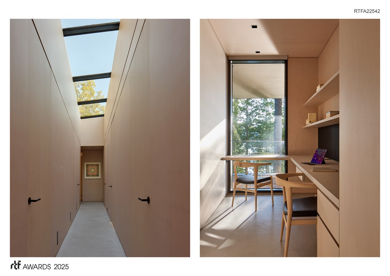 Material innovation and expert craftsmanship elevate the cottage’s modest wood, concrete, metal, and stone palette. Custom biscuit joinery ensures that plywood walls align without visible joints, while hand-troweled micro-cement floors add textural depth. A concealed hallway illuminated by a wall-to-wall skylight offers a poetic retreat to private rooms.