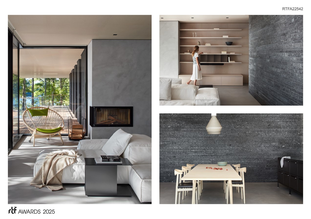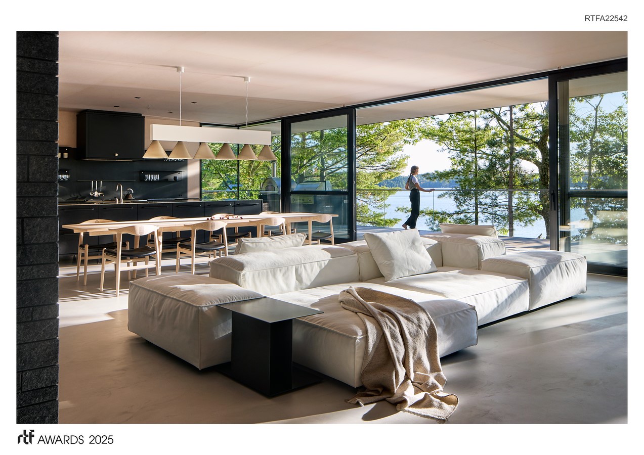 The main level, stacked above, is sheltered by a cantilevered roof that extends up to 16 feet. Viewed from the shoreline, only glimpses of its lean profile are visible through the trees. At the same time, black cladding allows the structure to dissolve into the forested landscape. Glass façades, partially obscured by dense foliage, ensure a discreet presence even when illuminated at night.