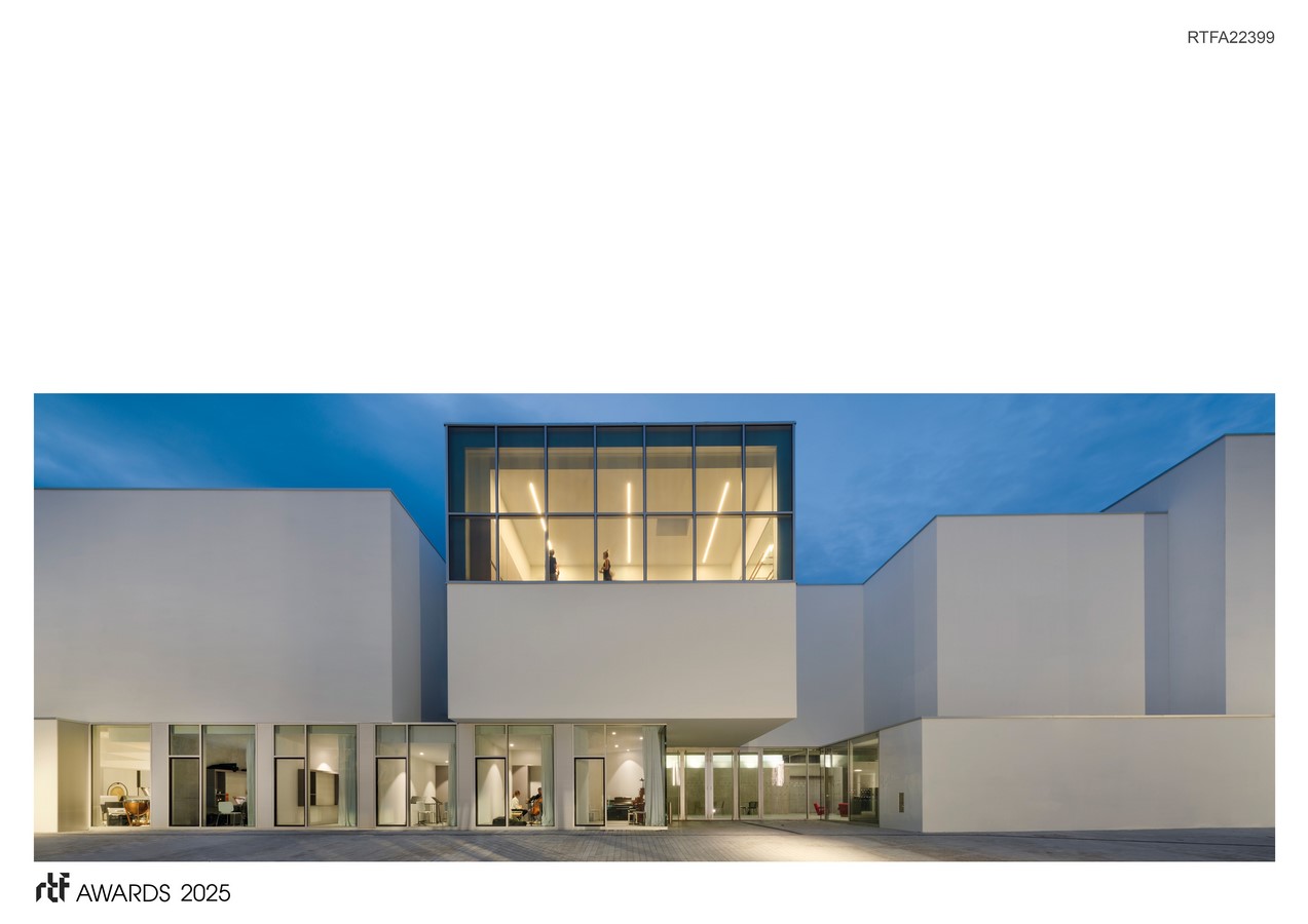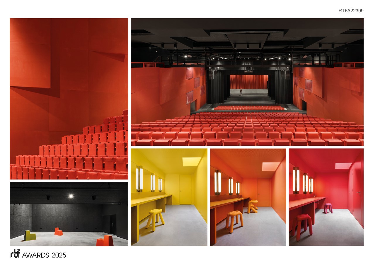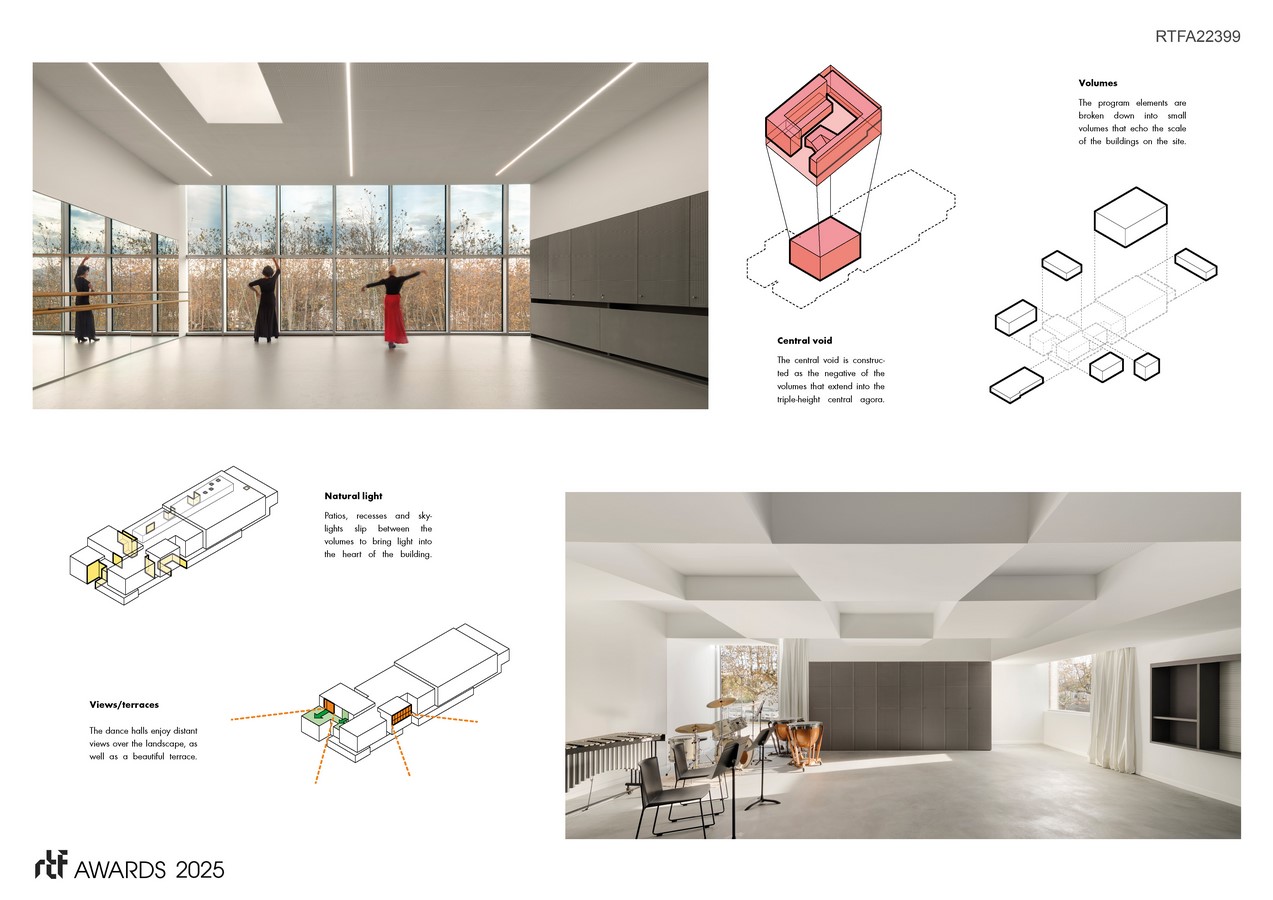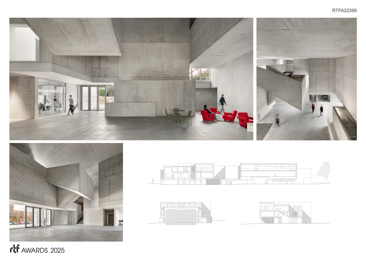 An atrium stretches up, like a self-evident feature, between two parts: to its east, a vast theatre; to its west, three levels that contain superimposed sections – a music school, theatre rooms and dance studios. This triple height gives the place a noble aspect. The atrium stands out as the centre’s beating heart that unites all the functions of the architectural programme within a collective structure and a site for sharing – a centre for togetherness and coexistence.