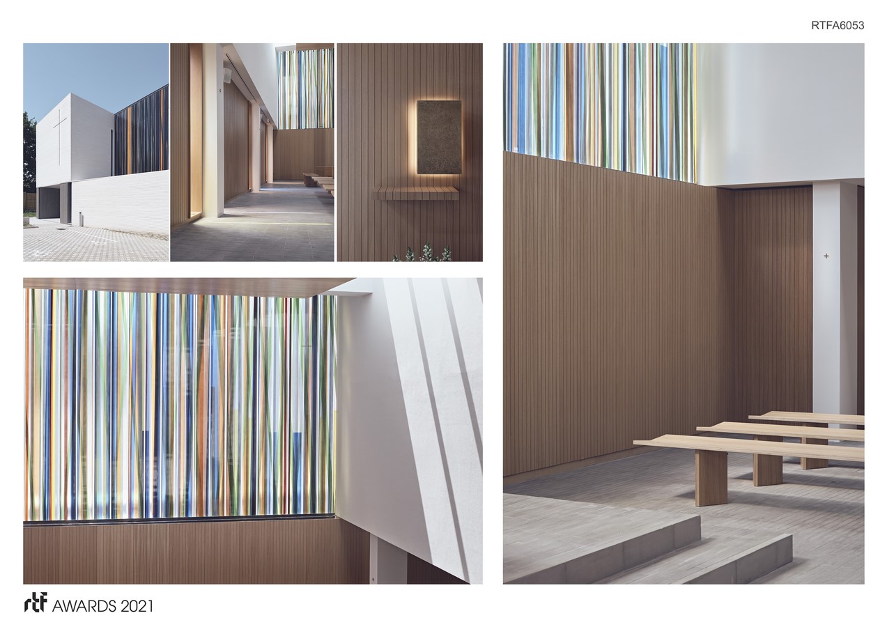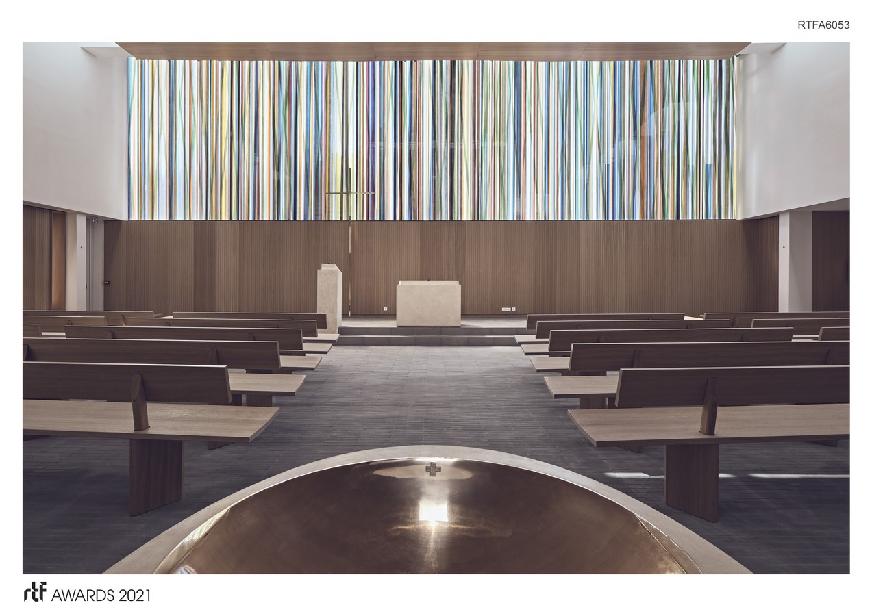 For the realization of the furniture and stained-glass windows of this project, we have collaborated with a team of craftsmen and artists experienced in working with noble materials. The stained-glass window expresses the “Space of Glory” which extends the mystical and gathering space; the stained-glass window transforms and converts light into the expression of the spiritual atmosphere.