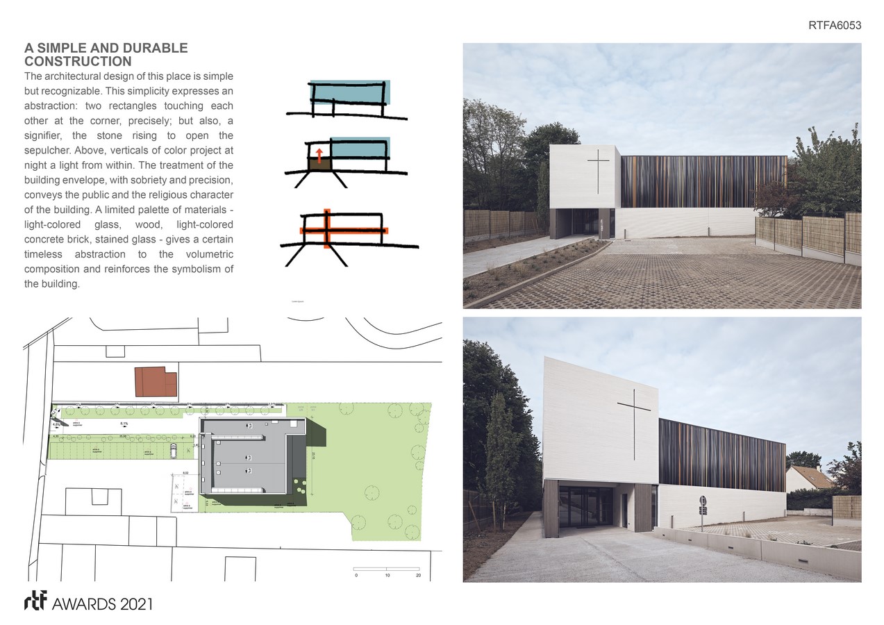 The architectural design of this place is simple but recognizable. This simplicity expresses an abstraction: two rectangles touching each other at the corner, precisely; but also, a signifier, the stone rising to open the sepulcher. Above, verticals of color project at night a light from within. The treatment of the building envelope, with sobriety and precision, conveys the public and the religious character of the building. A limited palette of materials – light-colored glass, wood, light-colored concrete brick, stained glass – gives a certain timeless abstraction to the volumetric composition and reinforces the symbolism of the building.