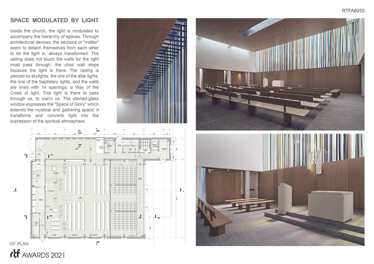 Inside the church, the light is modulated to accompany the hierarchy of spaces. Through architectural devices, the sections of “matter” seem to detach themselves from each other to let the light in, always transformed. The ceiling does not touch the walls for the light must pass through, the choir wall stops because the light is there. The ceiling is pierced by skylights, the one of the altar lights, the one of the baptistery lights, and the walls are lined with 14 openings, a Way of the Cross of light. This light is there to pass through us, to warm us. The stained-glass window expresses the “Space of Glory” which extends the mystical and gathering space; it transforms and converts light into the expression of the spiritual atmosphere.