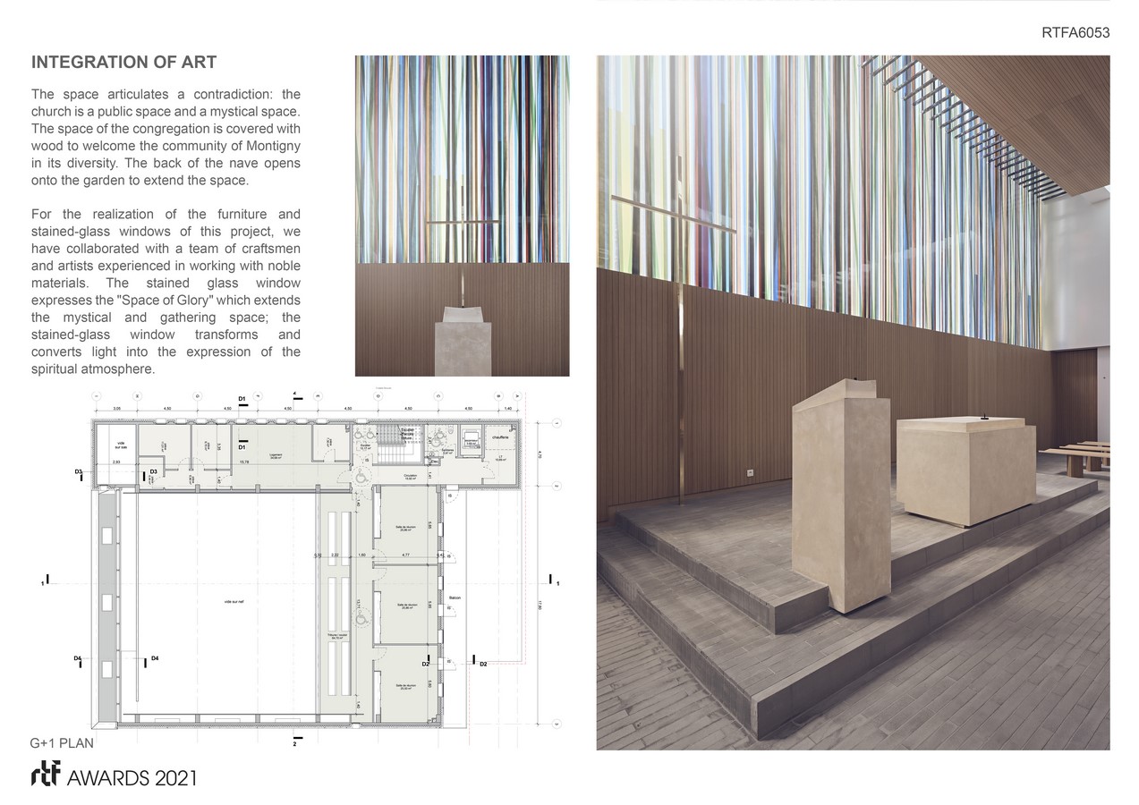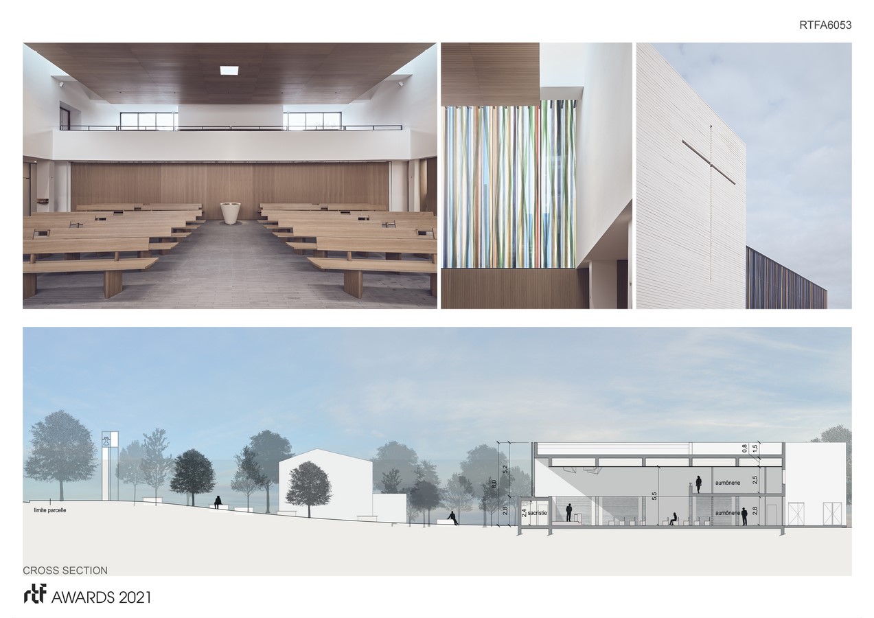 The space articulates a contradiction: the church is a public space and a mystical space. The space of the congregation is covered with wood to welcome the community of Montigny in its diversity. The back of the nave opens onto the garden to extend the space.