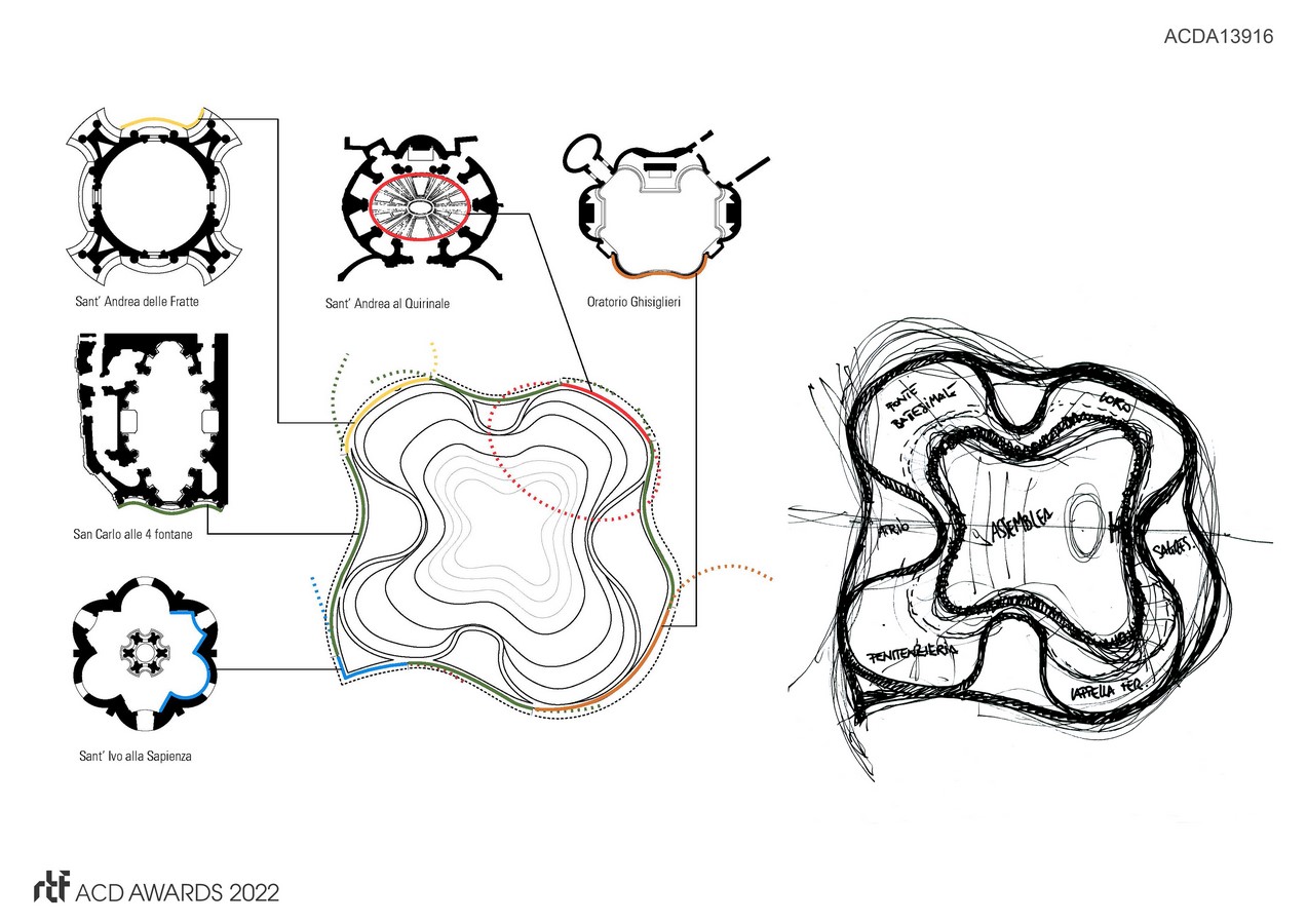 The monumental plan with an organic shape is inspired by the geometries of some of the most beautiful Baroque churches, such as the “Basilica of Sant’Andrea delle Fratte” and “al Quirinale”, both in Rome, the Ghisilieri Oratory in Ferrara, the church of “San Carlo alle Quattro Fontane” and the church of “Sant’Ivo alla Sapienza” in Rome.