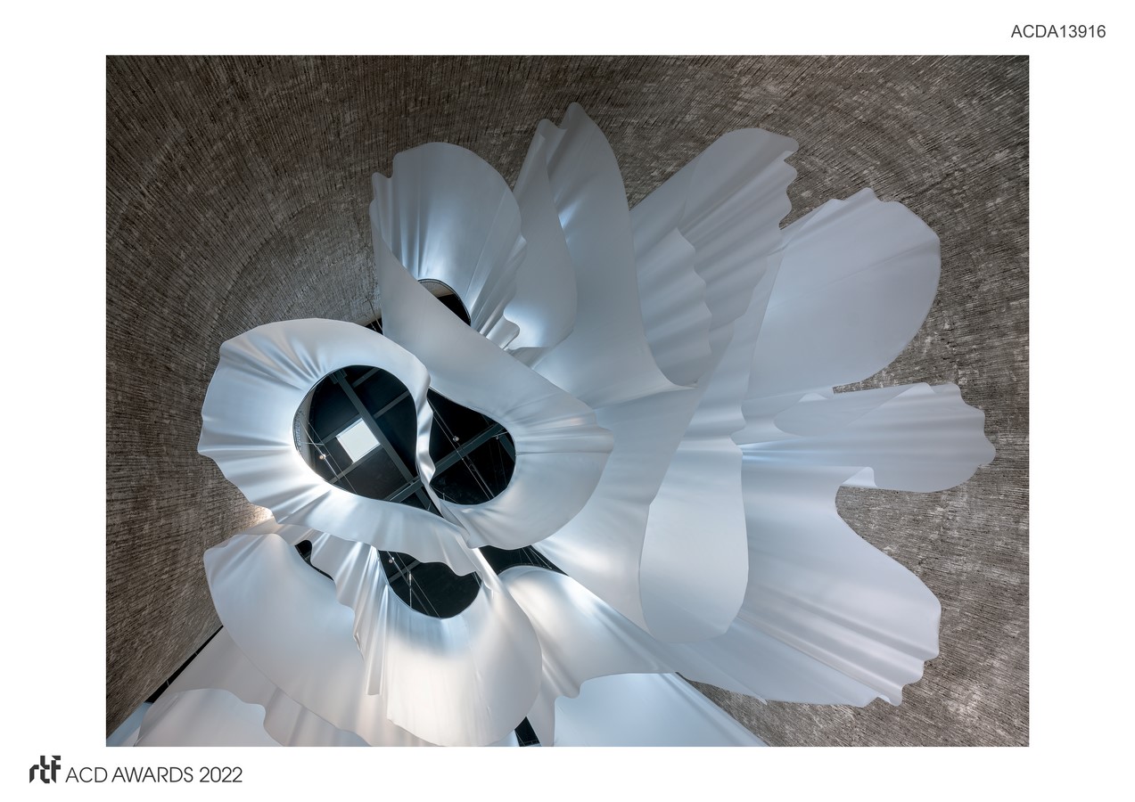 From the top of the Church, a series of translucent veils, like scenic drapes, fill the central space, reverberating natural light through its folds in a play of reflections that harks back to the mystical spectacle of the Northern Lights, thus creating an intimate and collected atmosphere.
