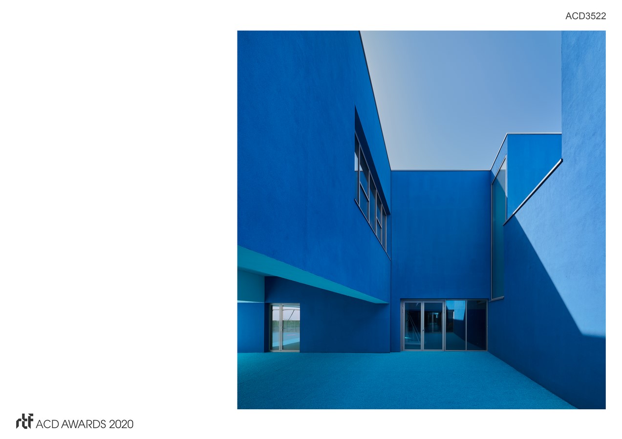 The presence of different shades of blue provides links that are at times unexpected. The areas of white on modified by the various shades of blue; variations are caused by the light and the changing angle of the sun. The colour modifies the white areas, which eventually appear to take on colour themselves. These variations in colour and light change throughout the day, depending on the changing angle of the sun, and as a result the white areas are never completely white; the multiple reflections give the areas a feeling of architecture in movement.