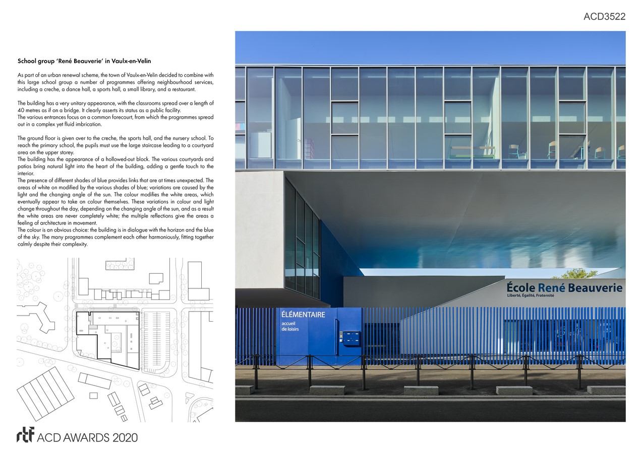 As part of an urban renewal scheme, the town of Vaulx-en-Velin decided to combine with this large school group a number of programmes offering neighbourhood services, including a creche, a dance hall, a sports hall, a small library, and a restaurant.